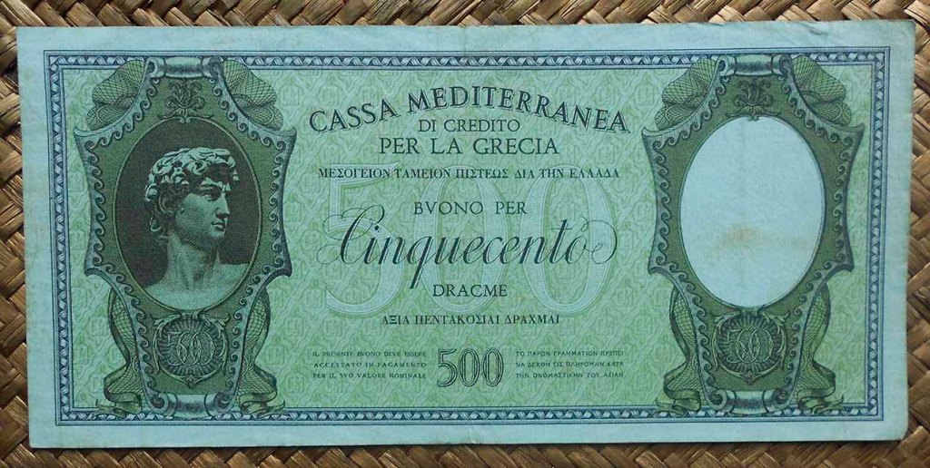 El billete de 500 dracmas de Grecia ocup. Italiana de 1941 presenta cromaticidad predominantemente verde en distintas tonalidades. El busto de David de Miguel Angel en el anverso.