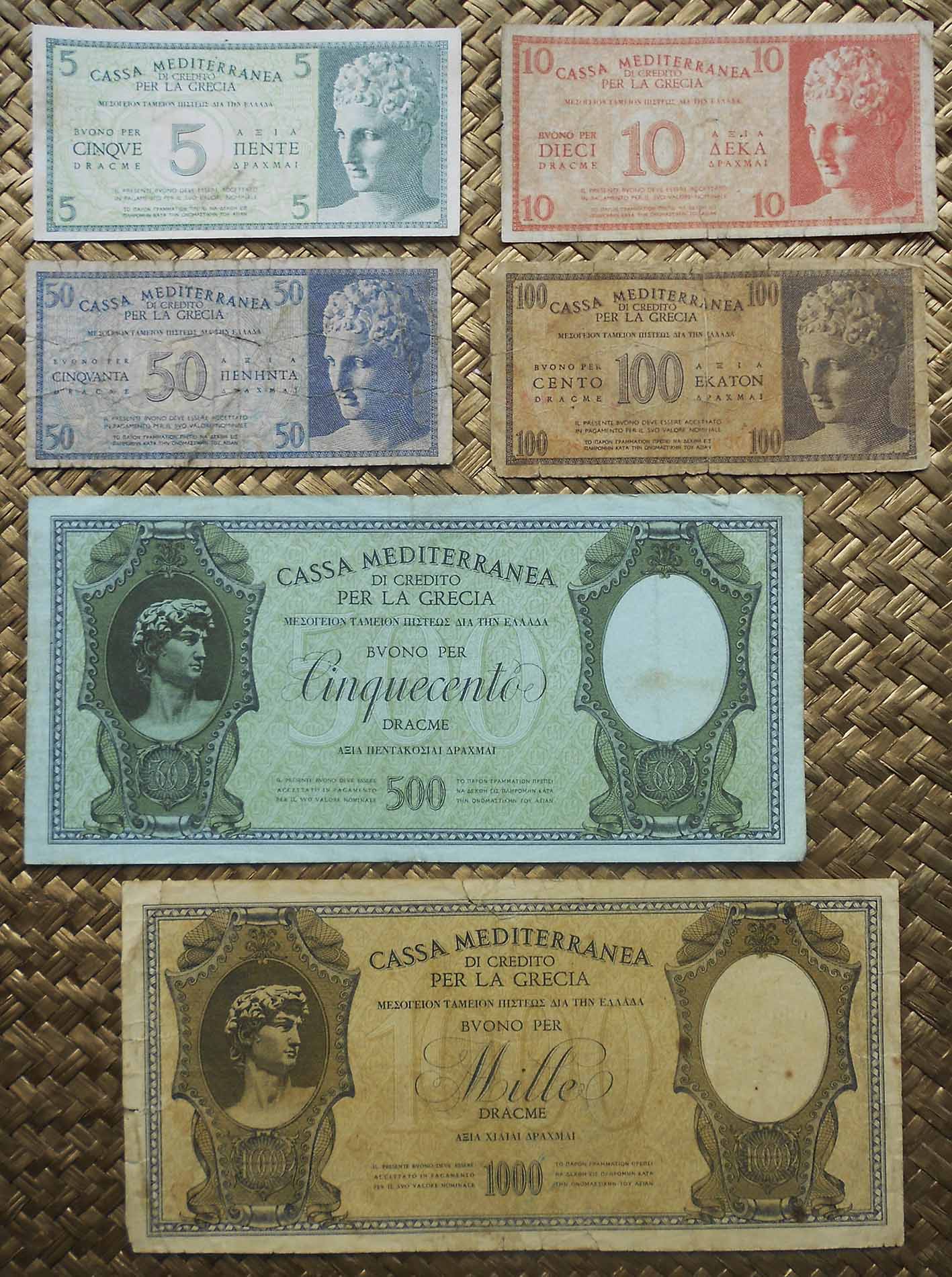 Grecia ocup. italiana WWII Serie dracmas 1941 –Cassa Mediterranea di Credito per la Grecia– anversos y reversos