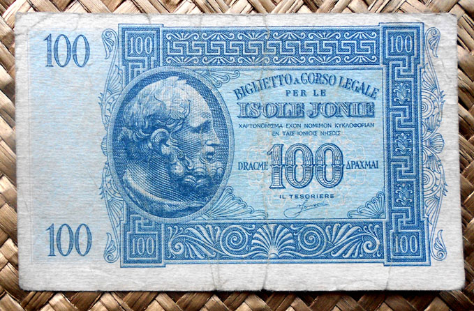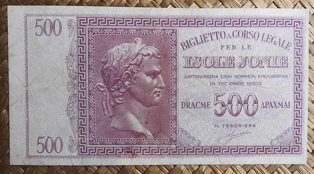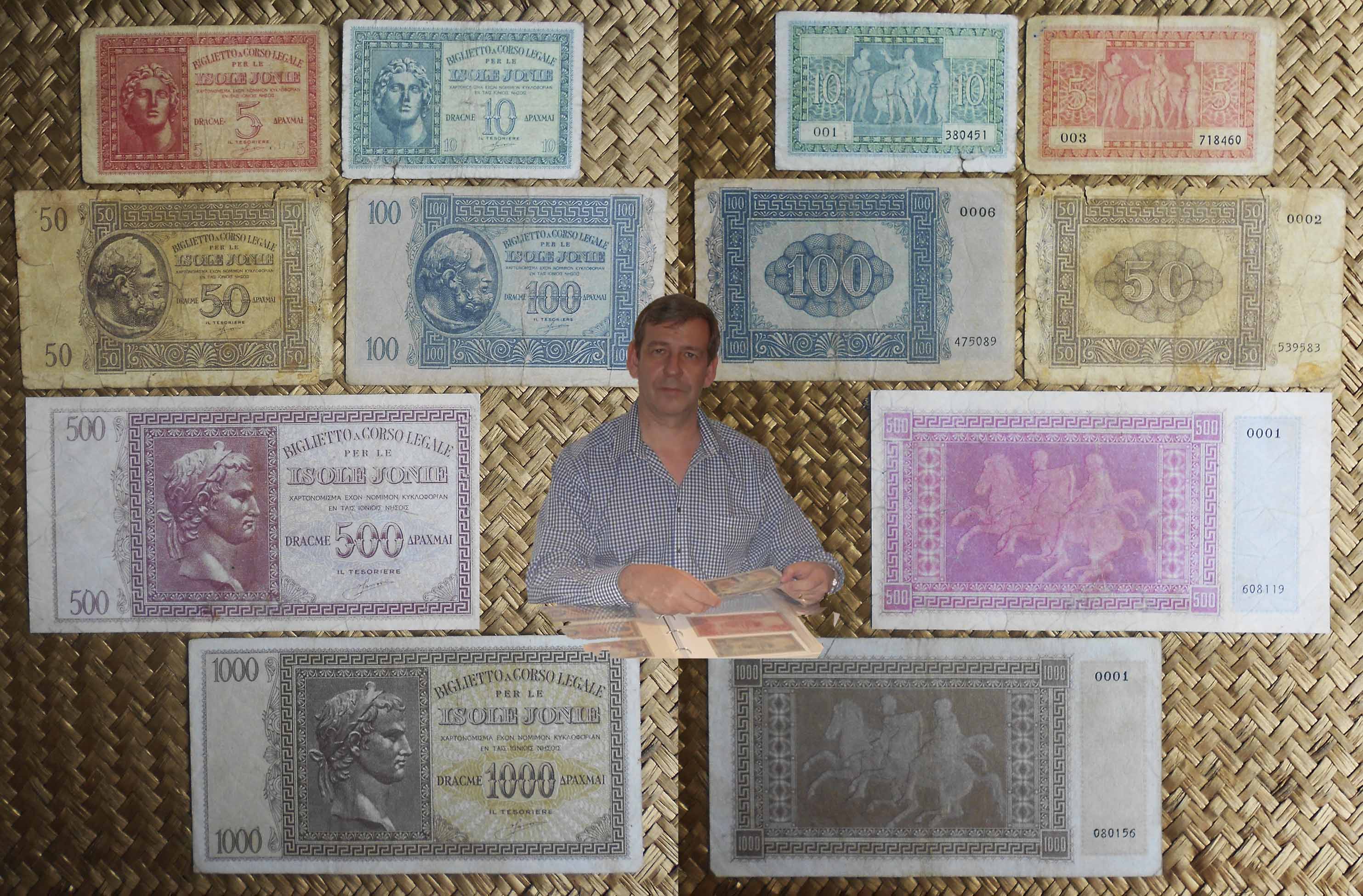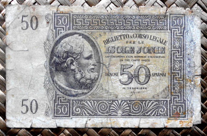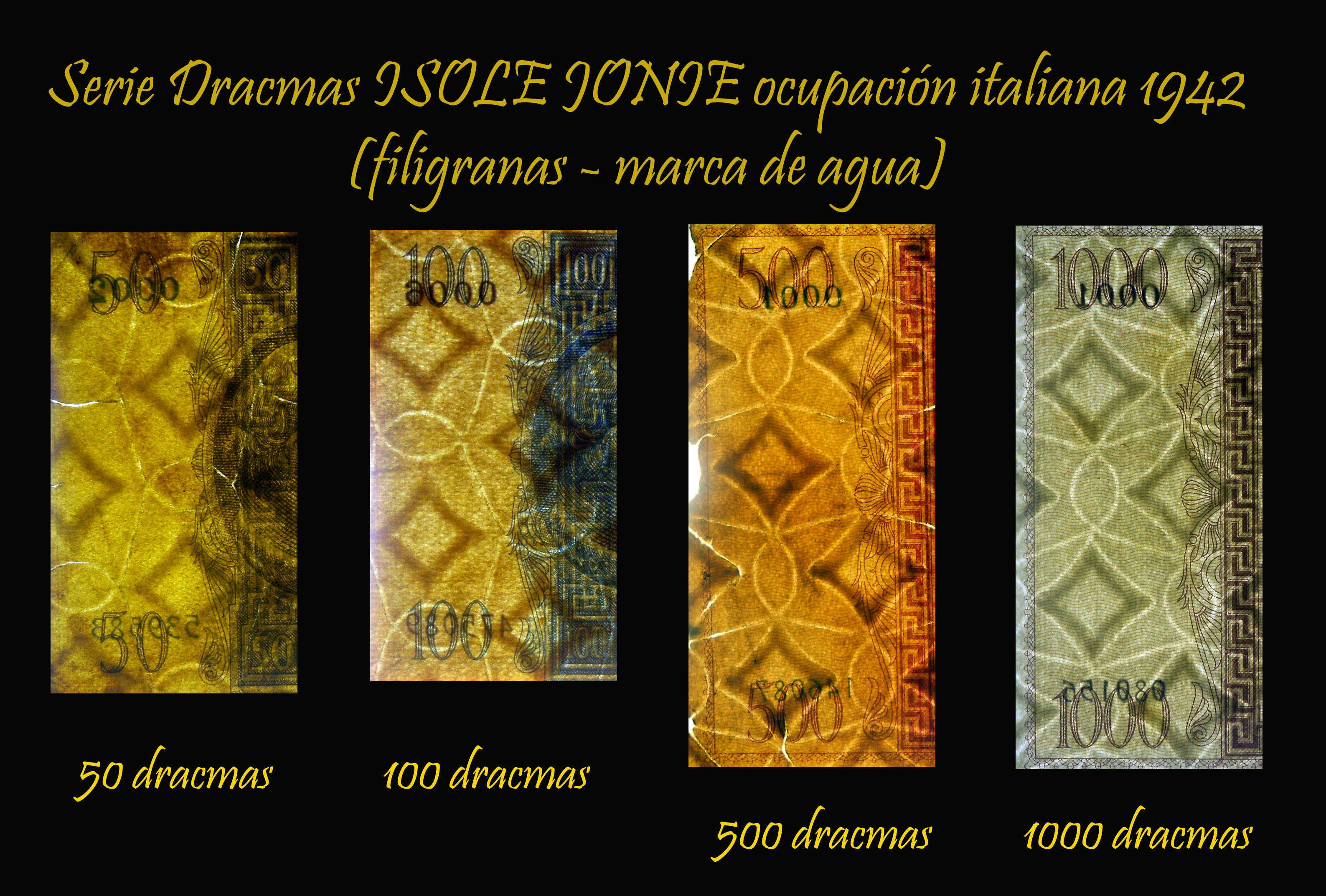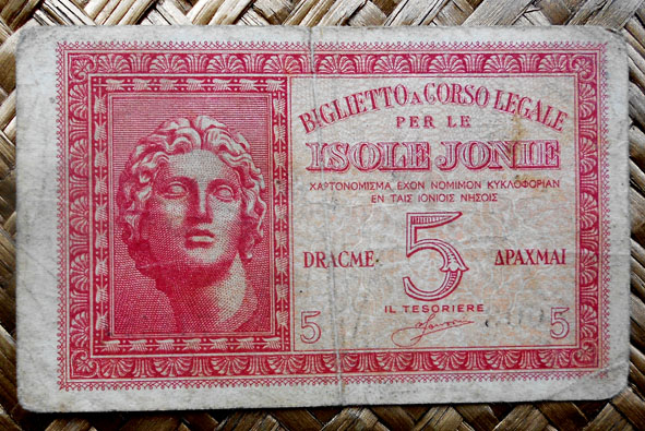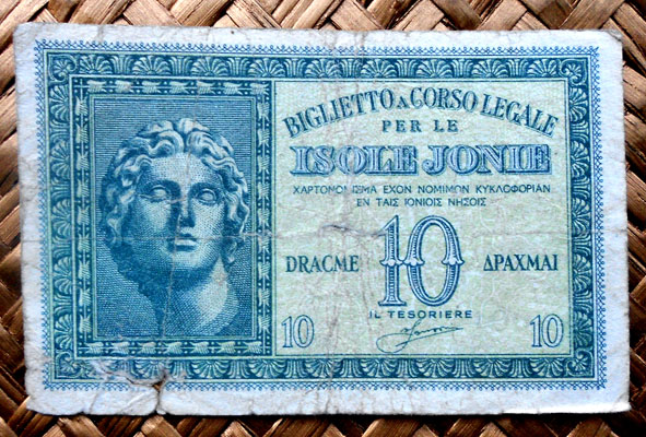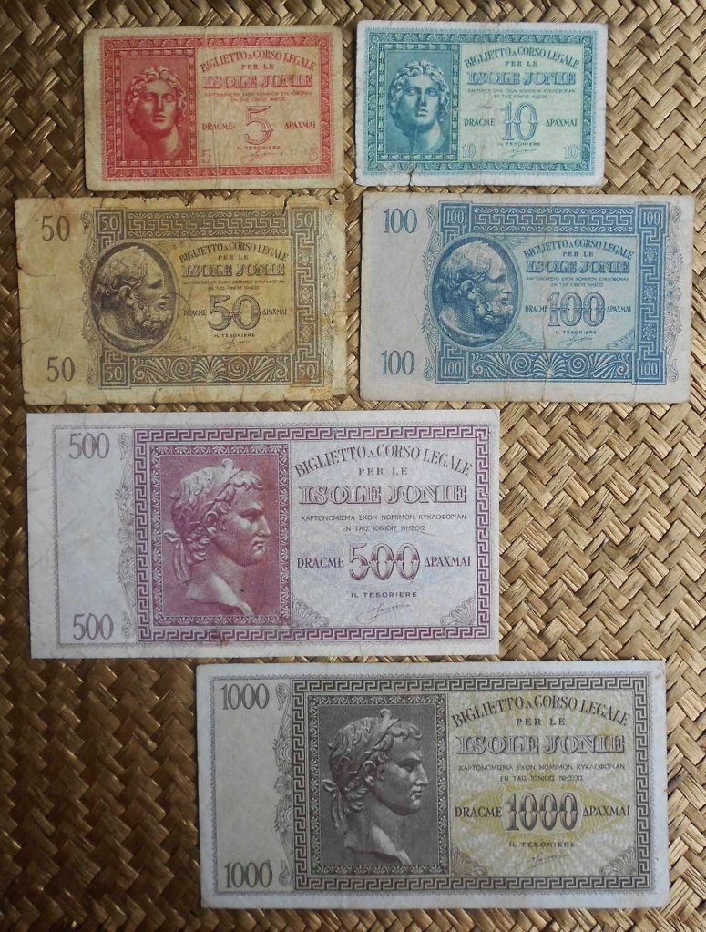 La serie de billetes que contemplamos forman parte de la emisión para estas “Isole Jonie” en 1942 por parte del gobierno italiano y para su uso en el territorio ocupado. Se emitieron dracmas en valores de 1, 5, 10, 50, 100, 500, 1000 y 5000, en billetes con textos en italiano y en griego y diseños con detalles escultóricos clásicos romanos y griegos.
