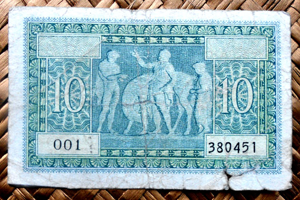 El billete de 10 dracmas de Grecia ocup. Italiana de 1941 presenta cromaticidad predominantemente roja. Apolo en el anverso y tallas de madera en el reverso.