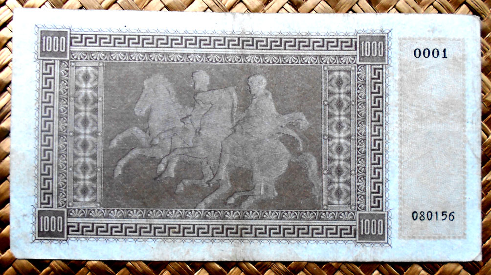 Paradojas del destino, estos billetes no valían 100 dracmas como su imagen mostraba, sino que los que se pusieron en circulación se validaron oficialmente con el resello de 1000 dracmas, por lo que la falsificación estaba servida; comenzaron a surgir resellos falsos para poder utilizarlos como dinero legal nada más el país fuese liberado. Poco duró la aventura, ya que el billete que estamos revisando, tanto con resello legal como manipulado apenas se mantendría en vigor unas semanas.