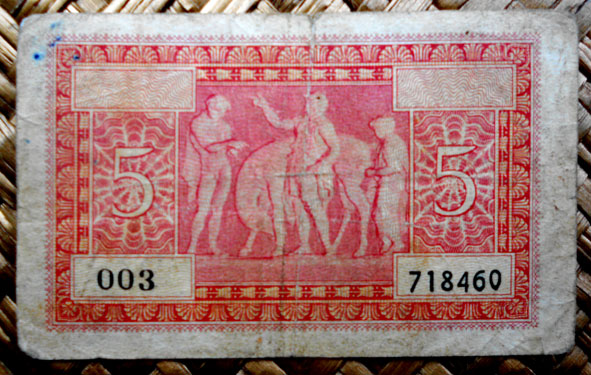 El billete de 5 dracmas de Grecia ocup. Italiana de 1941 presenta cromaticidad predominantemente verde. Apolo en el anverso y espigas en el reverso.