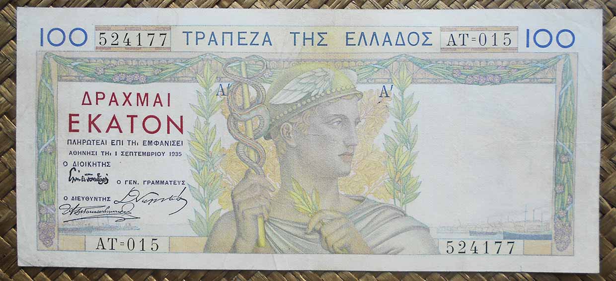El billete de 100 dracmas de 1935 nos muestra en su anverso al dios Hermes con casco alado, una rama de olivo en una mano y en la otra un caduceo (varita o cayado de pastor entrelazada por dos serpientes).