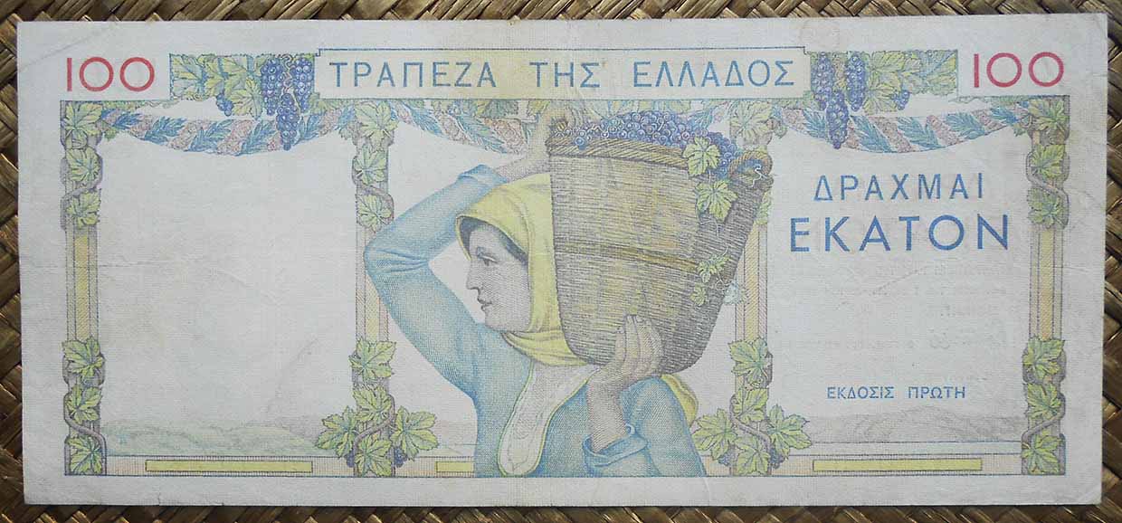 Repasaremos la historia del billete de 100 dracmas de Grecia de 1939, que no circularía como tal sino resellado con un valor diez veces superior. Todo comenzó cuando Grecia encarga a la empresa inglesa Waterlow & Sons la renovación de su billetario entre 50 y 1000 dracmas (50, 100, 500 y 1000). La entrega de los ejemplares de 100 dracmas sufrió un ligero retraso, suficiente para que este valor no pudiese circular como el resto de la emisión. Cuando Grecia fue invadida por los italianos y alemanes la escasez de billetario de gran valor le obligó a resellar estos ejemplares con el valor de 1.000 dracmas, que sacarían a la circulación a mediados de 1941. Por tanto, el billete de 100 dracmas sin resello nunca circuló.
