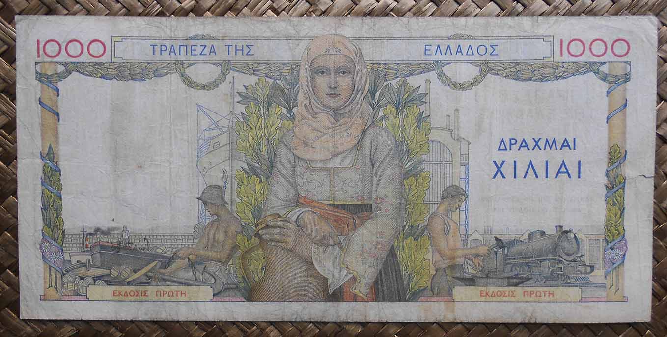 El billete de 1000 dracmas de 1935 nos muestra en su anverso a una mujer con el atuendo típico de Spetses (isla griega conocida antiguamente como Pityoussa).