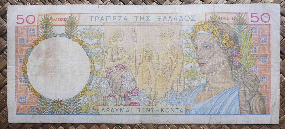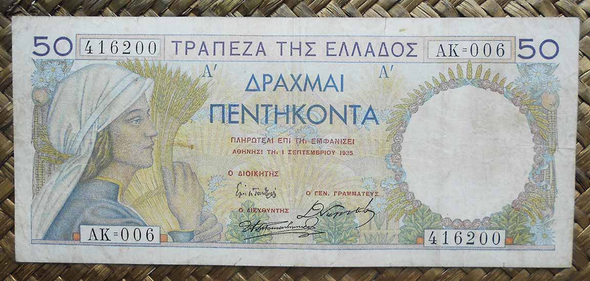 El billete de 50 dracmas de 1935 nos ofrece en su anverso a una joven campesina con una hozada de mies en sus brazos. En su reverso, al centro un grabado del conocido como “relieve de Eleusis” (Eleusis es una ciudad cercana a Atenas  muy entroncada con el culto a la diosa Deméter y su hija Perséfone); en él, esculpido en mármol, se representa a Triptolemo (príncipe de Eleusis) entre Deméter y Perséfone, recibiendo espigas de trigo de los dioses para transmitirle el saber de la agricultura.