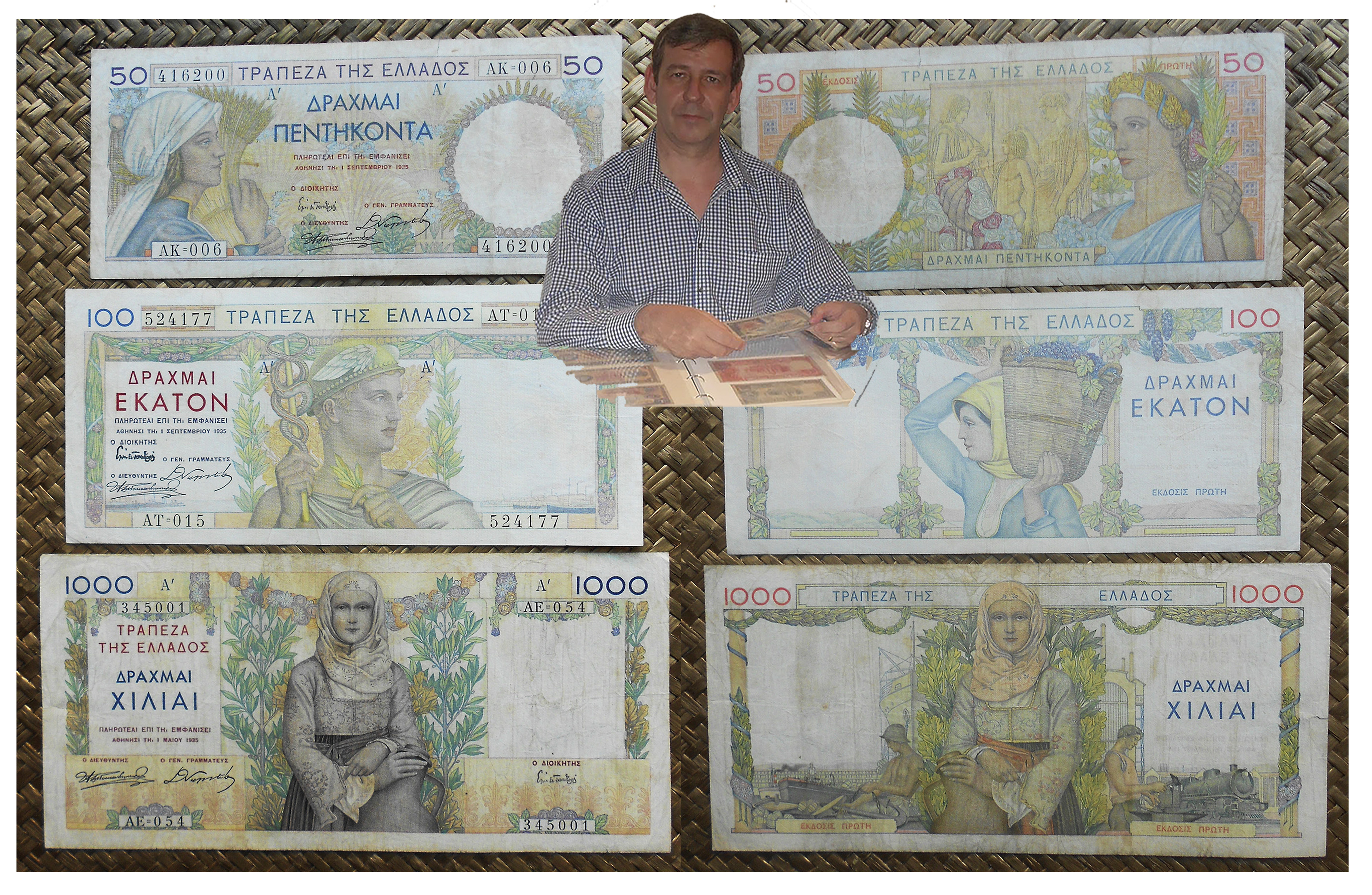 Los primeros billetes de la posguerra griega fueron puestos en circulación en 1944, e impresos por Bradbury, Wilkinsons & Co. de Londres, pero sería a partir de 1947 y a través del “Banknote Printing Works of the Bank of Greece”(IETA) cuando, con maquinaria moderna, excelentes artistas, dibujantes, grabadores y especialistas comenzarían a imprimir dracmas para su uso patrio.