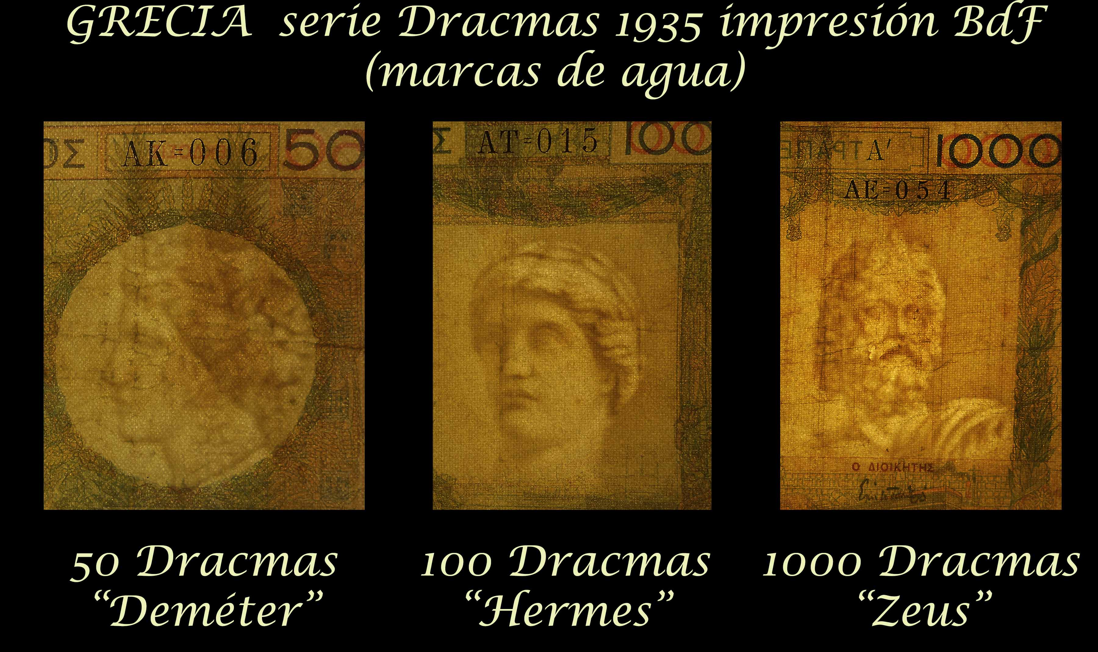 En cuanto a sus marcas de agua, nos ofrecen la cabeza divinizada de Deméter (Ceres en la mitología romana) en el billete de 50 dracmas, Hermes (Mercurio en mitología romana) en el billete de 100 dracmas y al dios Zeus (Júpiter en la mitología romana) en el billete de 1000 dracmas.