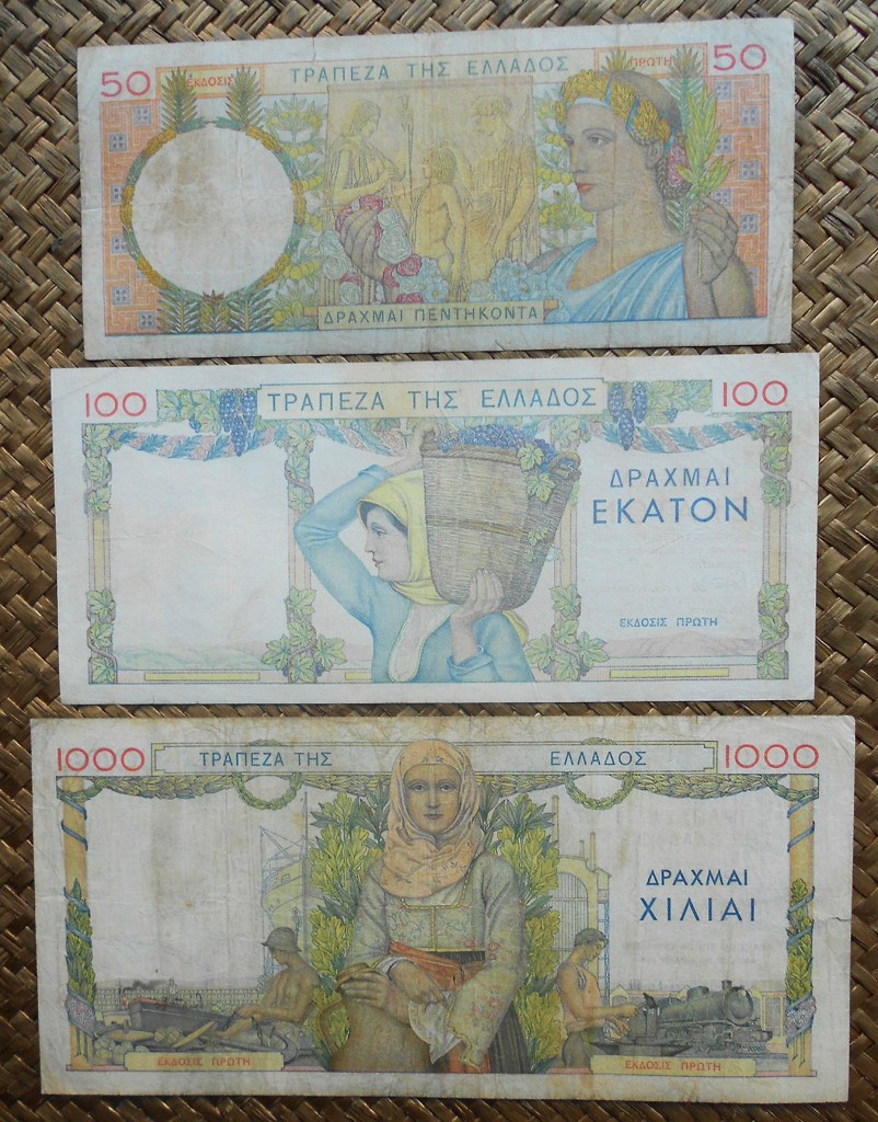 Impresos por el Banco de Francia, su creación artística, corrió a cargo de la escuela francesa; obras del artista Sébastien Laurent y los grabadores Georges Beltrand, Camile Beltrand, Jules Piel, Emile Deloche, Rita Dreyfus y Georges Hourriez, inconfundible entonces su “puesta en escena”. La serie está compuesta por los valores de 50, 100 y 1000 dracmas.