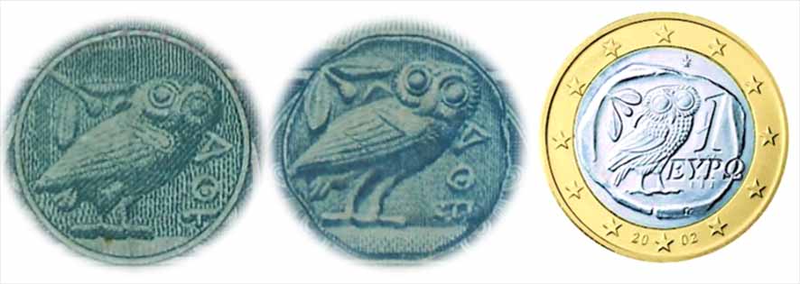 Casualidades de los tiempos, el euro griego en la actualidad nos ofrece en su reverso la figura del búho/mochuelo/lechuza del tetradracma y la rama de olivo, aunque omitiendo las tres primeras letras de Atenas (ΑΘΕ) que sí aparecen en la viñeta de los billetes.