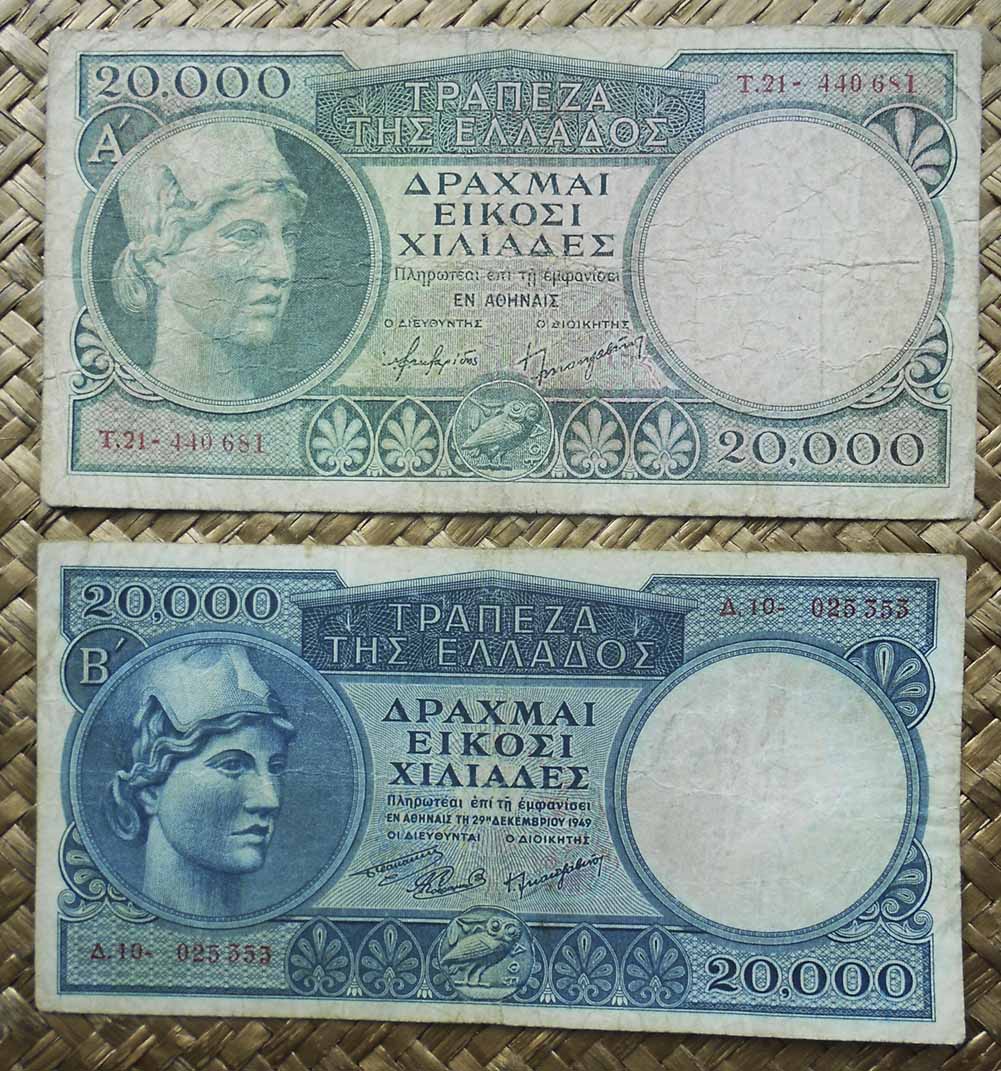 Grecia 20.000 dracmas 1947 vs. 1949 Atenea anversos y reversos
