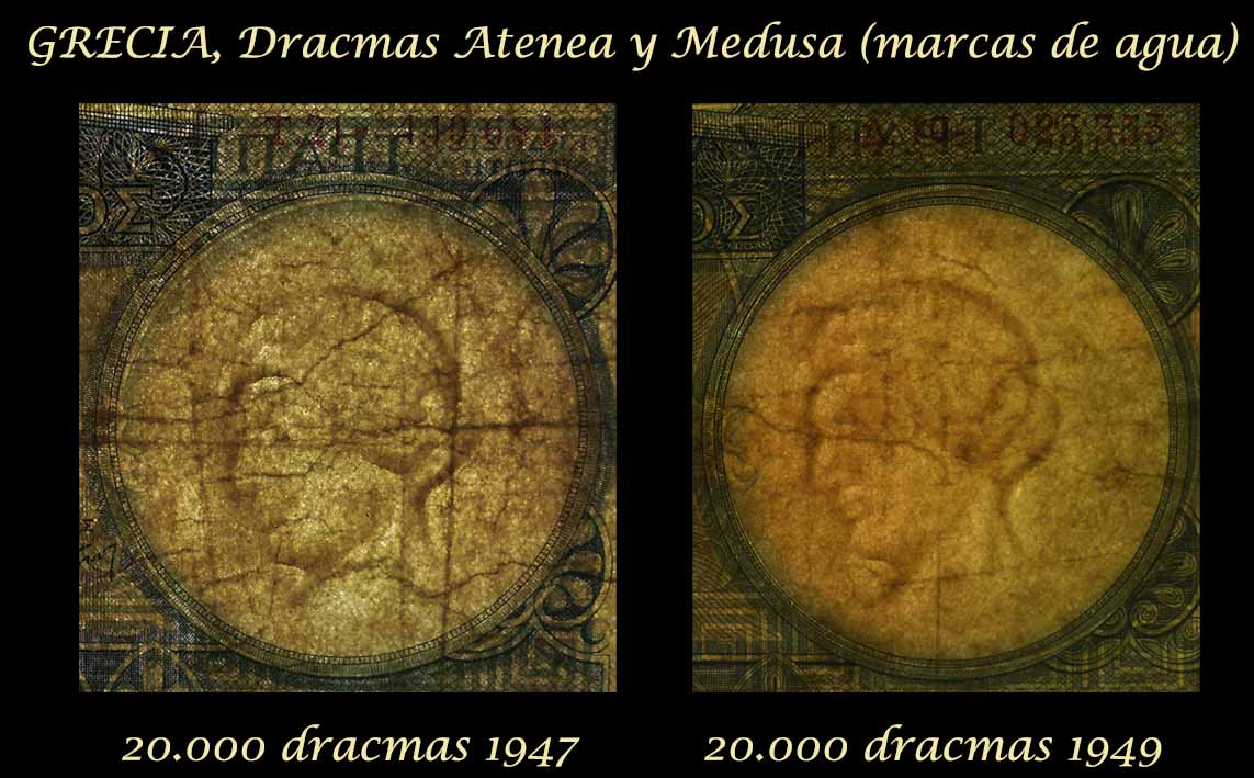 Sus marcas de agua, desde sencillas filigranas en los de menor valor a una extraordinaria cabeza de Atenea en los mayores. El de 5 dracmas solo muestra un 5 descentrado hacia un lateral, los de 10, 50 y 100 dracmas muestras al trasluz una filigrana de óvalos con rombos en su interior. Para los de 500 y 1000 dracmas se nos guarda una filigrana de líneas onduladas y una cabeza de la mitológica diosa griega Atenea realmente bella.