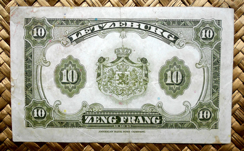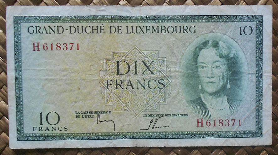 El billete de 10 francos de Luxemburgo de 1954 nos ofrece a la Duquesa Carlota en el anverso y para el reverso el castillo de Vianden, al norte de la capital, (fortificación del s. XI-XIV de estilo entre románico y gótico; se construyó sobre un refugio carolingio del s.IX) entre laderas. A su centro el escudo de armas (un león rampante sobre el blasón, guarnecido por sendos leones a los lados y corona granducal a su cabeza). Tonalidades predominantes verdes. Textos y marcos también en verde.