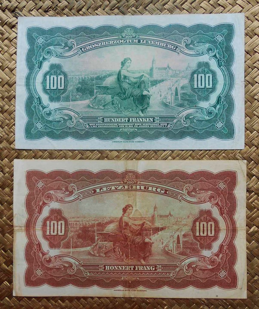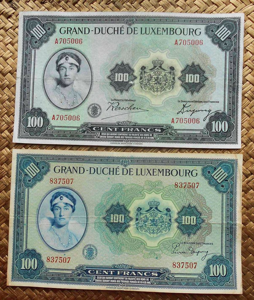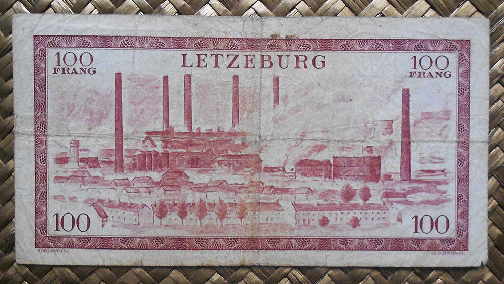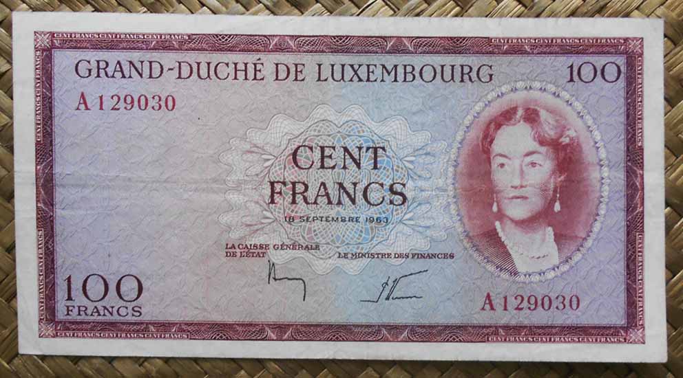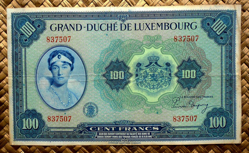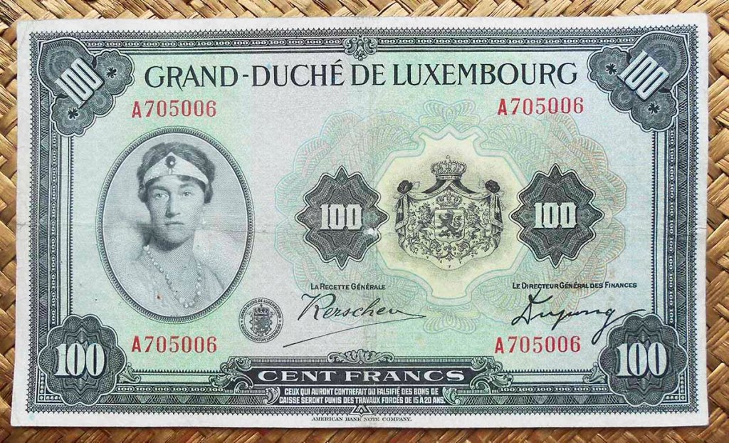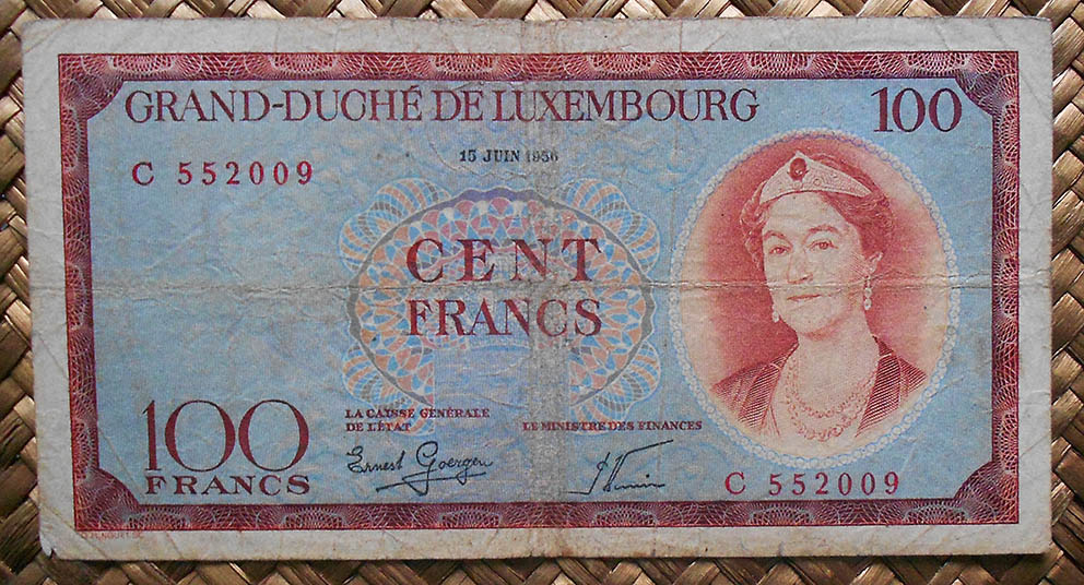 El billete de 100 francos de Luxemburgo de 1956 nos muestra a la Duquesa engalanada con la tiara de diamantes y esmeralda (montada por el joyero parisino Chaumet en 1926) al anverso. Para el reverso una vista aérea de la acería de Differdange, ciudad industrial al suroeste de la capital. Tonalidades cromáticas granates y azuladas. Textos y marcos en color rojo.