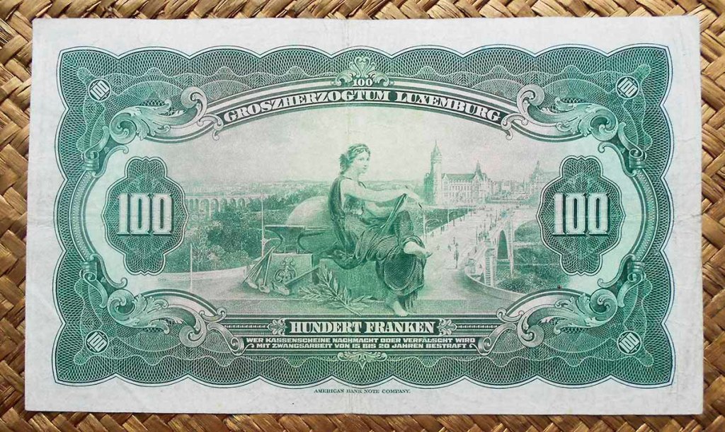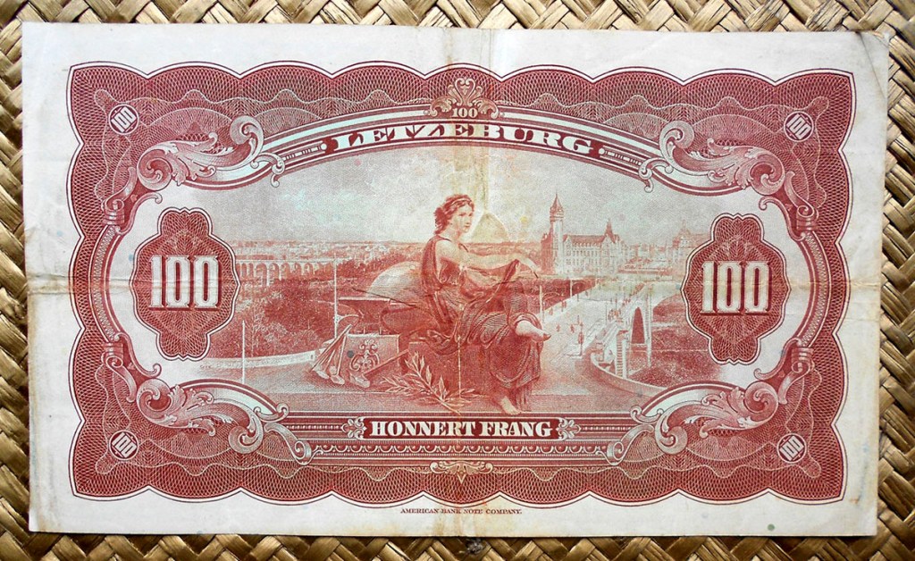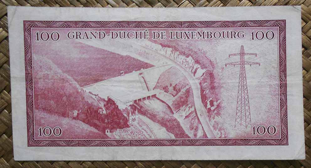 El billete de 100 francos de Luxemburgo de 1963 nos muestra a la Duquesa Carlota en el anverso y para el reverso una vista de una central hidroeléctrica. Tonalidades predominantes rojas granates.