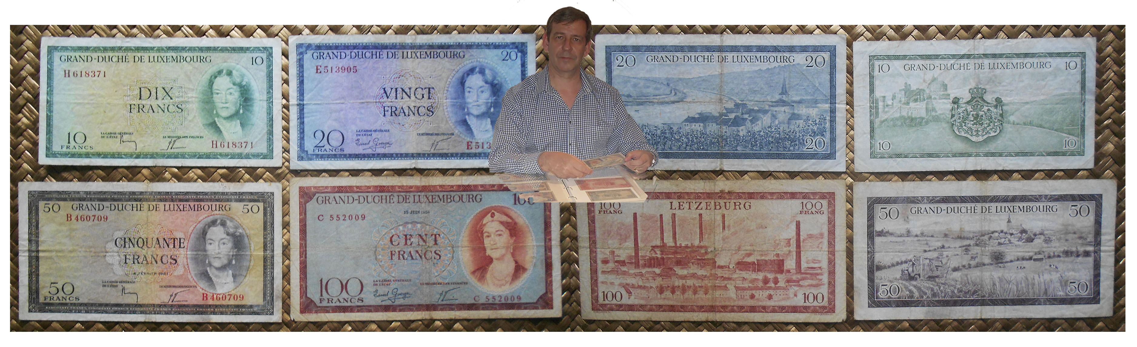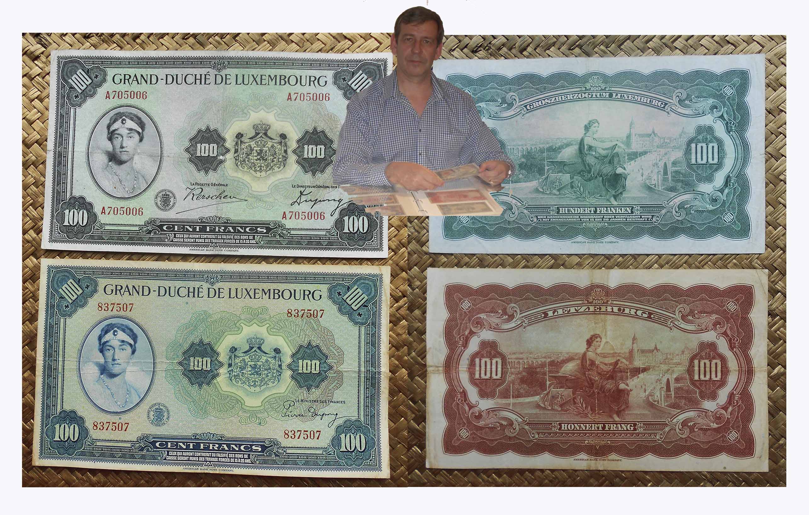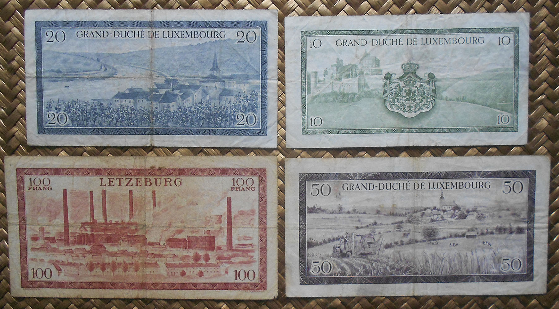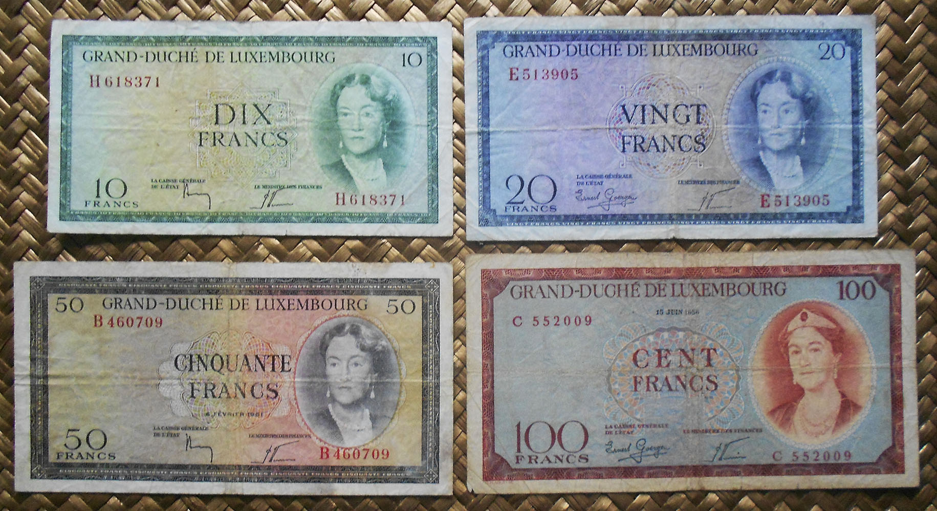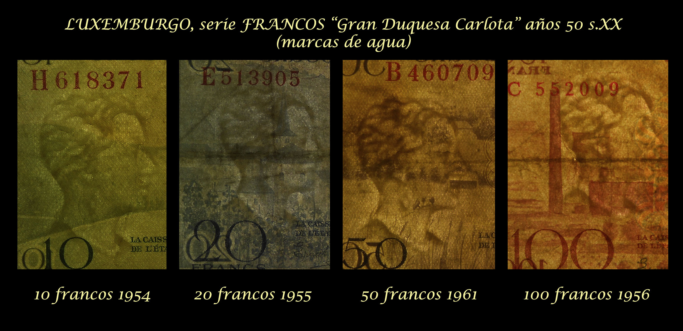 Revisaremos los billetes de Luxemburgo de 10 francos de 1954, de 20 francos de 1955, de 50 francos de 1961 y de 100 francos de 1956 y 1963. El busto de la Gran Duquesa Carlota aparecerá en los anversos de todos los valores de la serie. Textos en francés y números de serie en color rojo.