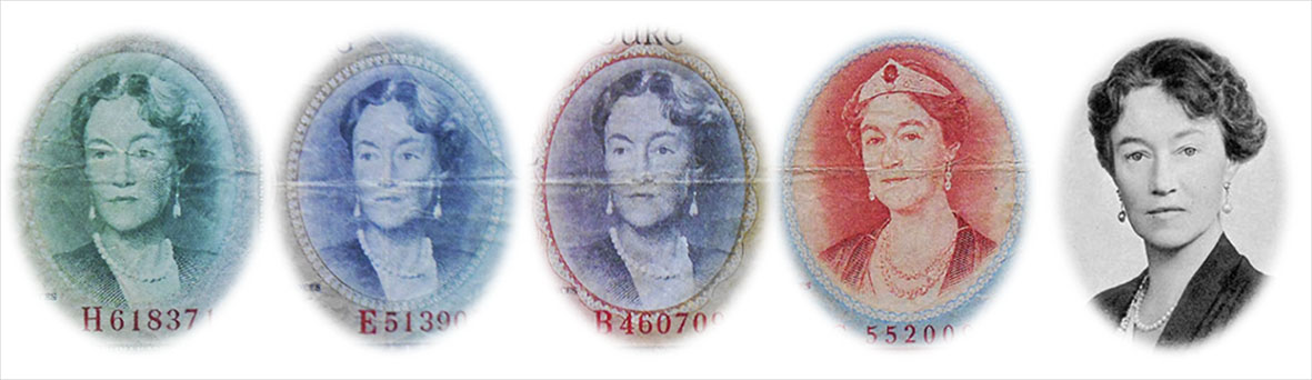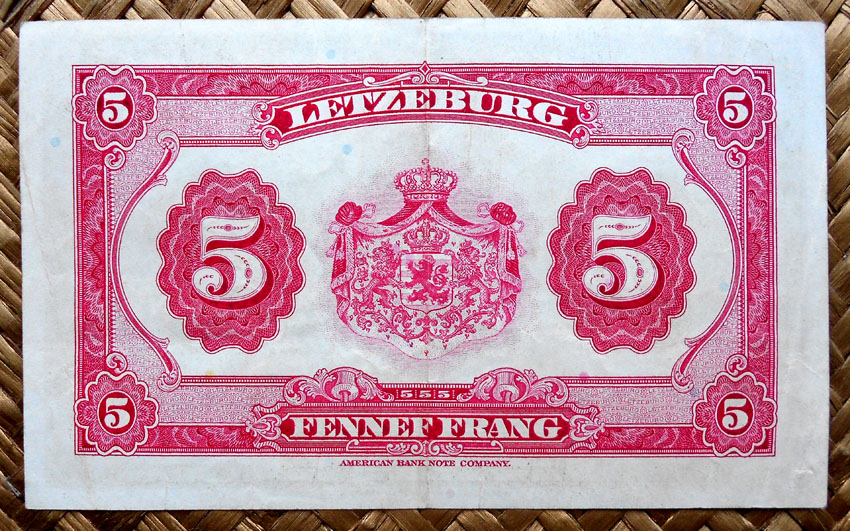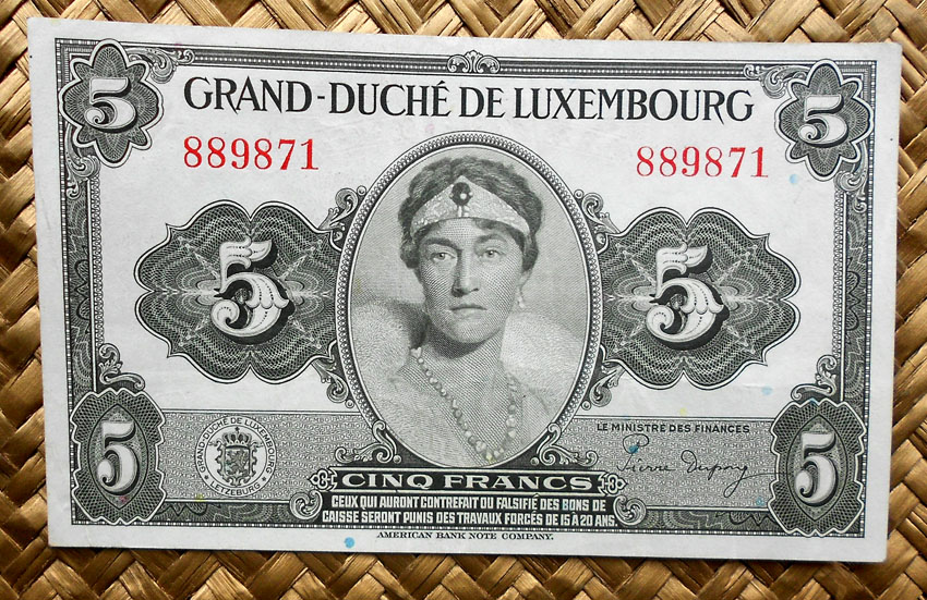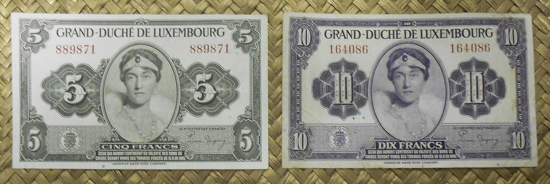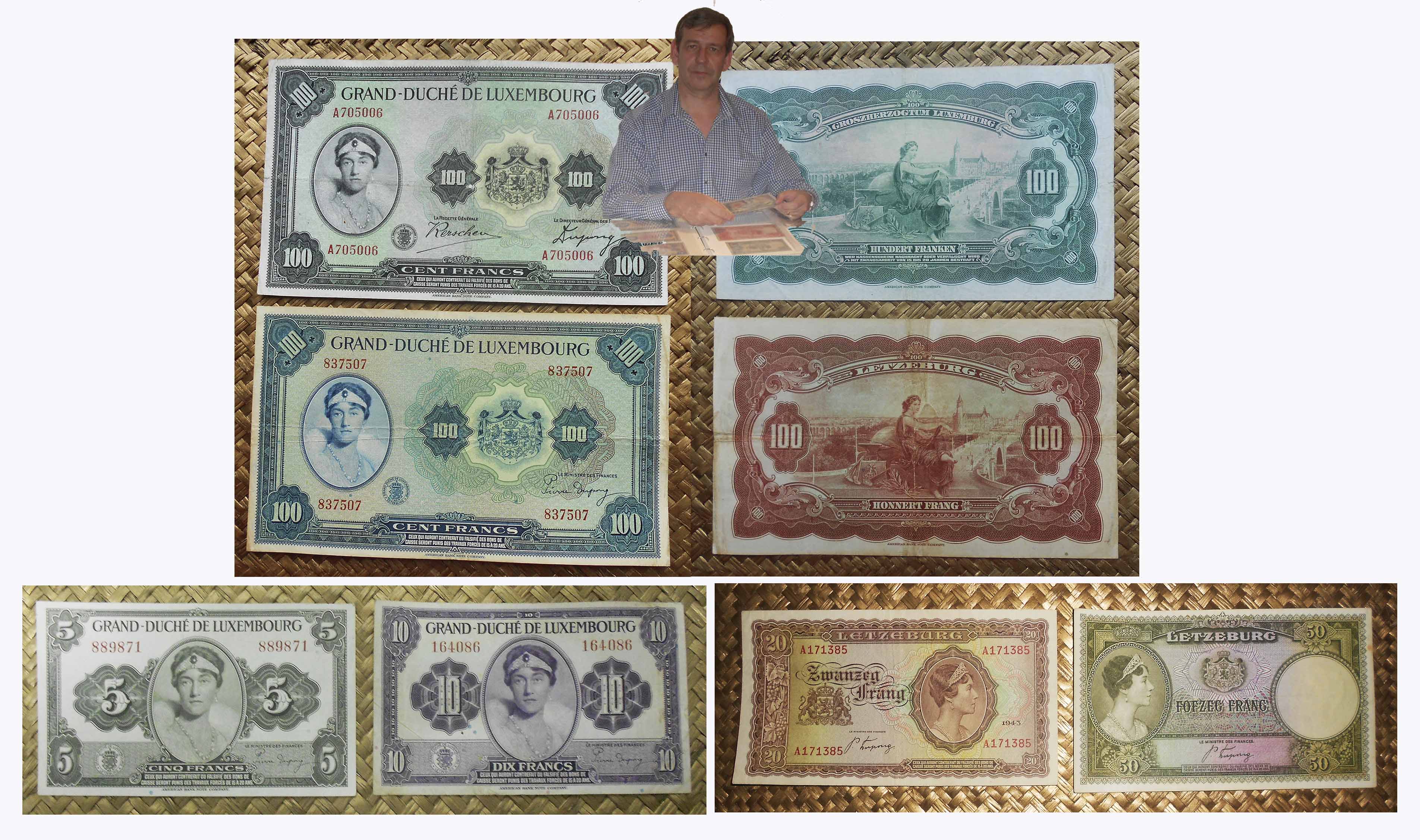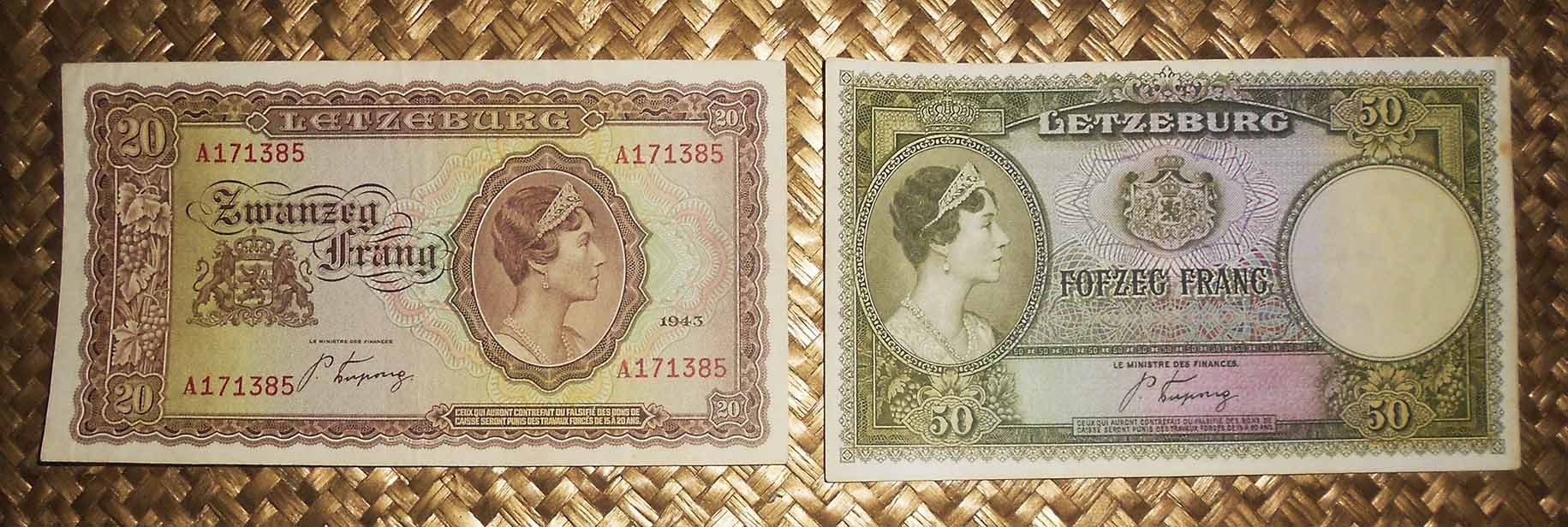 La serie que os muestro es de mediados del siglo XX, entre 1954 y 1961 y nos presenta nuevamente unos billetes cuya retratística ensalza el culto al héroe nacional, esta vez en la persona de su máximo referente como monarquía, la Gran Duquesa Carlota de Luxemburgo (1896-1985), monarca del país entre 1919 y 1964.