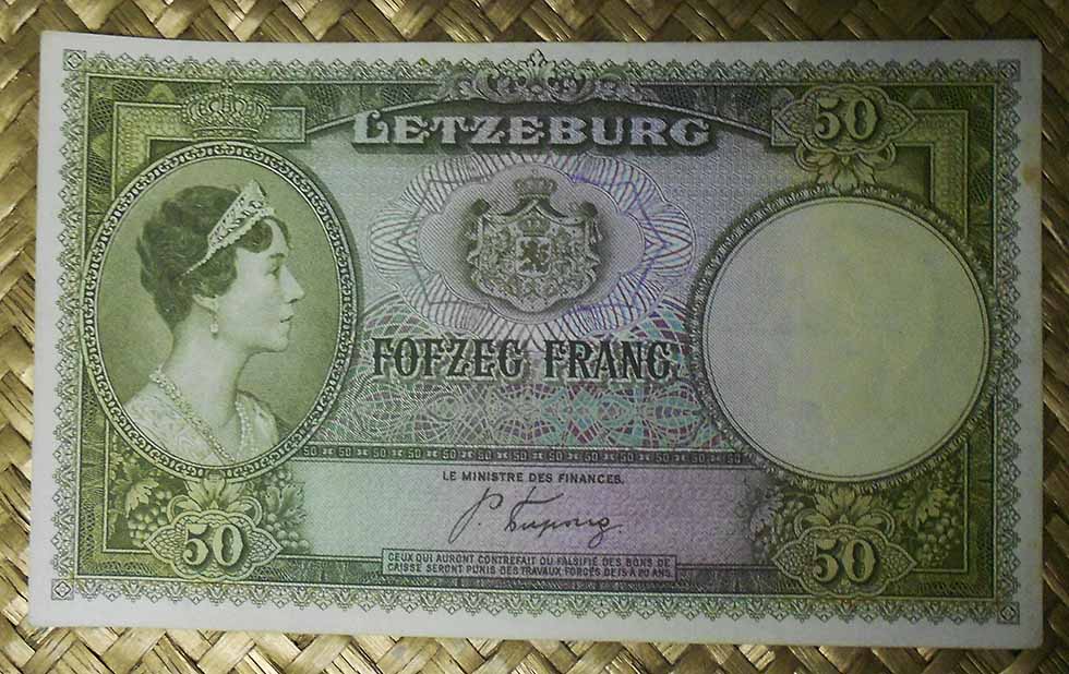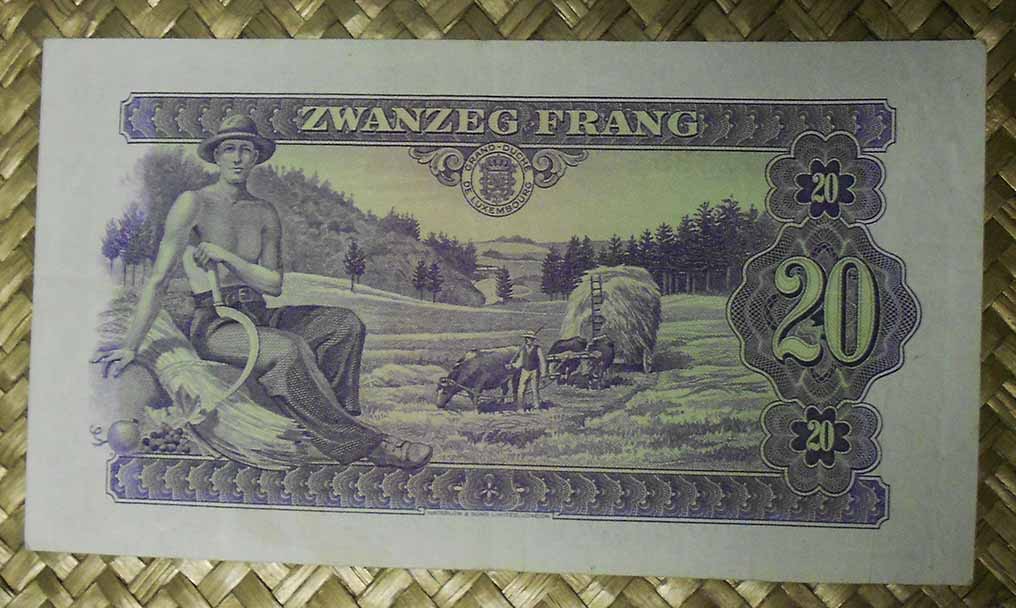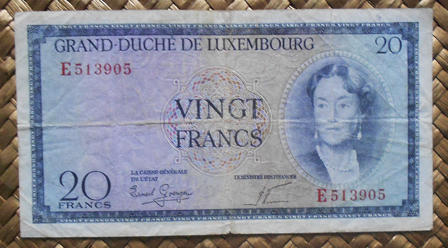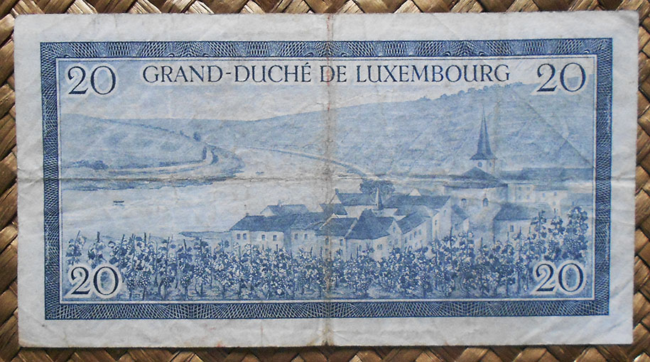 El billete de 20 francos de Luxemburgo de 1955 nos muestra a la Duquesa presidiendo el anverso y para el reverso una vista del pueblo de Ehnen, en el sureste de Luxemburgo, a orillas del río Mosela. Tonalidades predominantes azules. Los textos y marcos también en azul.