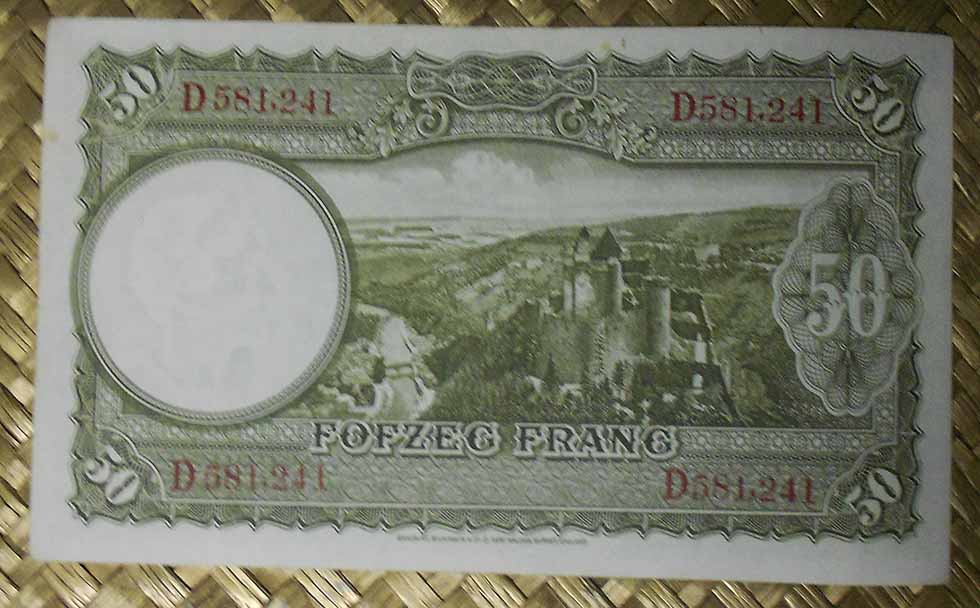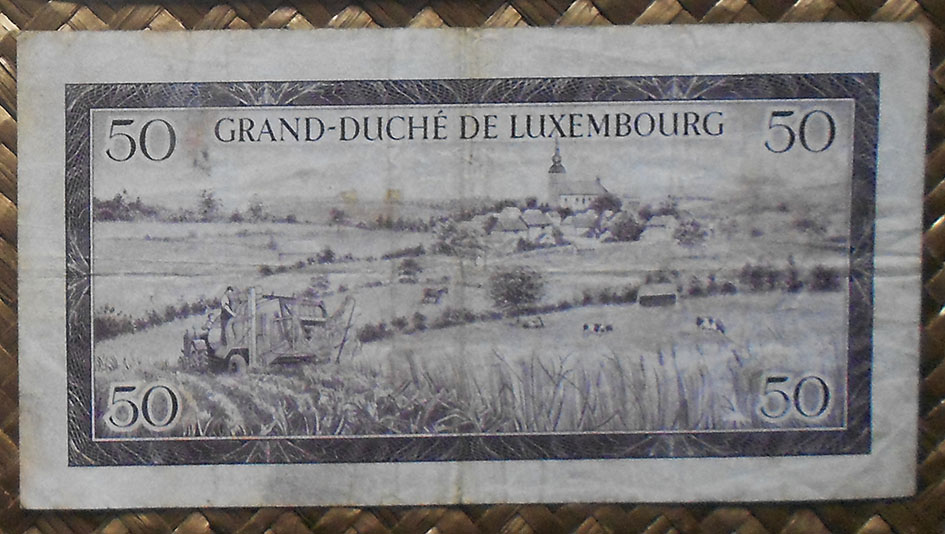 El billete de 50 francos de Luxemburgo de 1961 nos vuelve a ofrecer a la Duquesa Carlota en el anverso y para el reverso una vista del pequeño pueblo de Koerich, en el oeste de Luxemburgo, con una cosechadora en tareas agrícolas en los campos limítrofes. Tonalidades predominantes marrones y amarillas y textos en marrón.