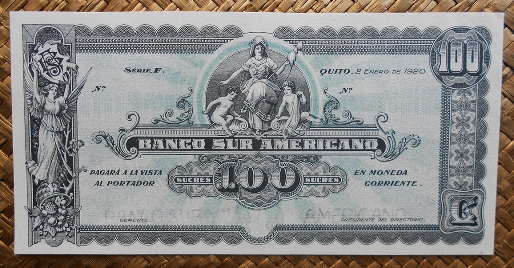 Contemplaremos los billetes de 5 pesos de México de 1914 (del Banco de Coahuila), de 100 rublos de 1918 del Gobierno Provisional de East Siberia (región rusa de Priamur) y de 5 sucres de 1949 de Ecuador. Los tres ejemplares están presididos por la diosa de la Agricultura, la Cosecha y la Fecundidad, portando en sus manos una antorcha de espigas de trigo y una hoz, y rodeada de frutas, racimos de uvas y fardos de mieses. Unos grabados realmente artísticos y bien aceptados por los países receptores.