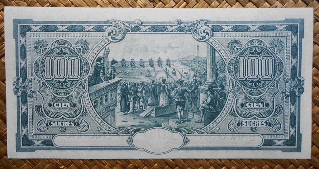 Para el reverso vemos el escudo de armas de Ecuador, con un cóndor sobre un blasón en el que se representa el volcán Chimborazo, el río Guayas y una banda con un sol y cuatro signos zodiacales. Protegen el blasón lateralmente dos pares de banderas, uno con una rama de laurel y otro con una rama de palma. A los pies unos fasces.