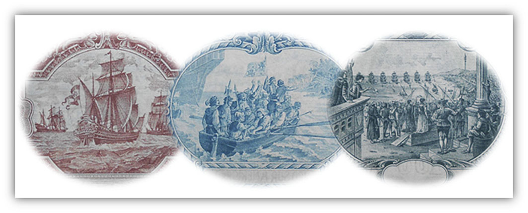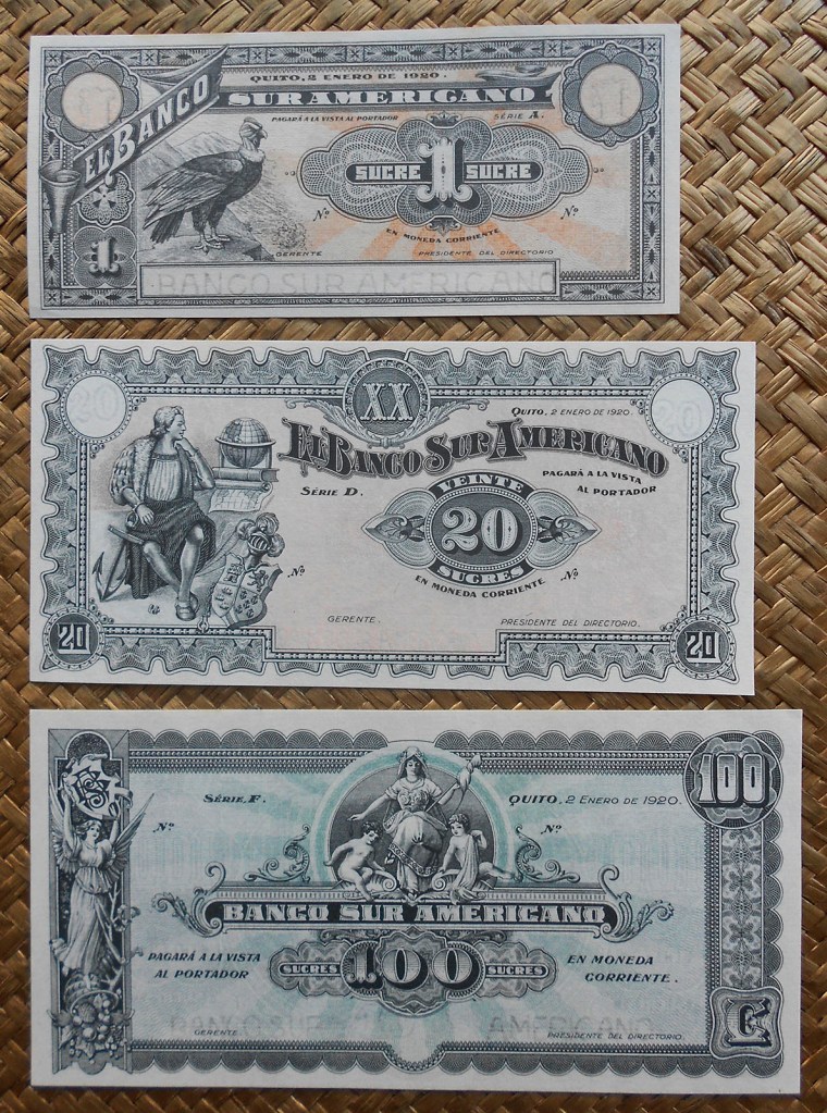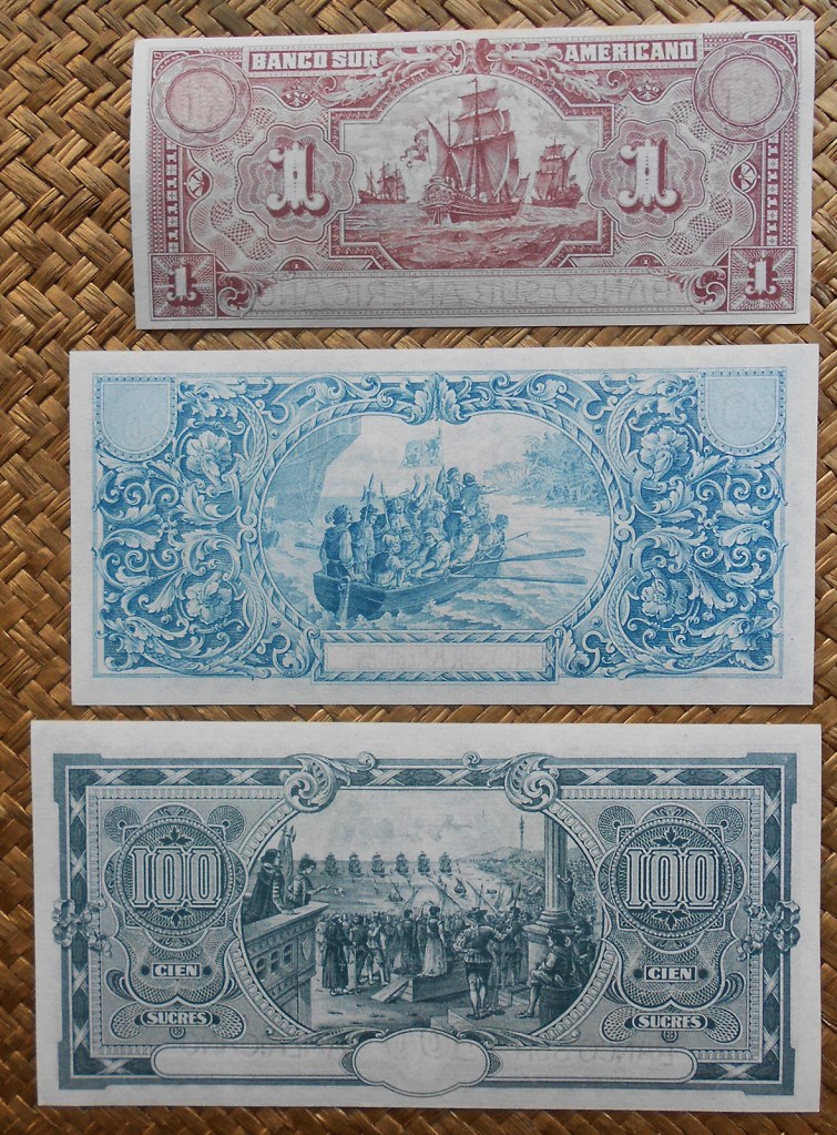 De la mano de la ABNC (American Bank Note Company de Nueva York) vamos a revisar tres billetes con un grabado común, pero de distintos países, con diferentes tipos de moneda y de fechas separadas entre ellos más de siete lustros. Parece ser que los “comerciales” de la empresa de impresión no conocían el significado de la palabra “exclusividad” y cuando les funcionaba un diseño, viñeta o dibujo lo promocionaban a todo el mundo “sin contemplaciones”.