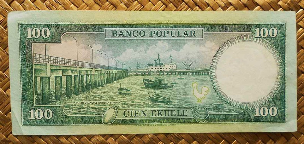 El billete de 100 ekueles nos ofrece a Macias Nguema al anverso y el muelle del puerto Macías con embarcaciones en el reverso.