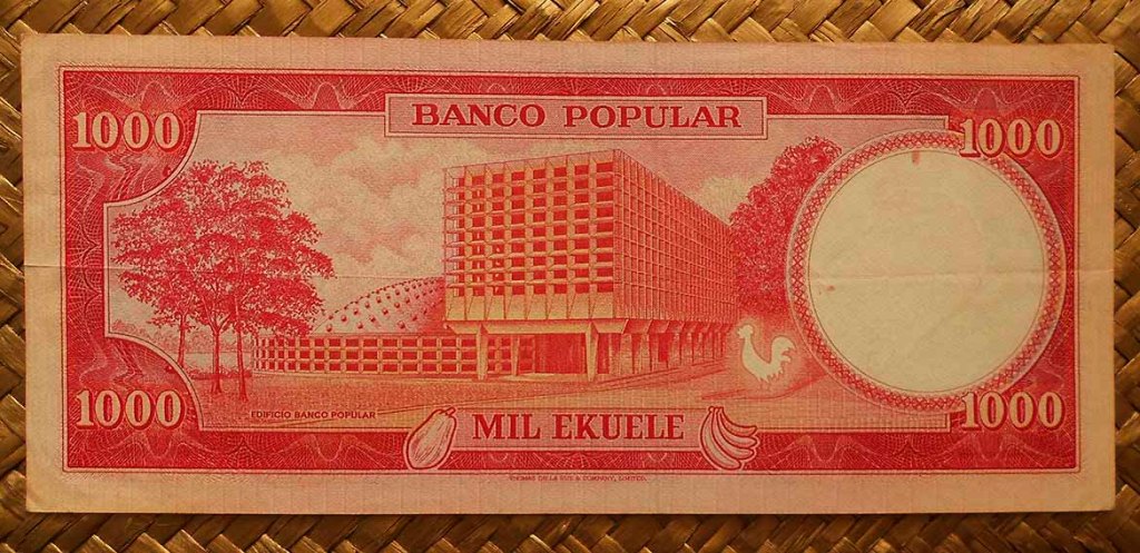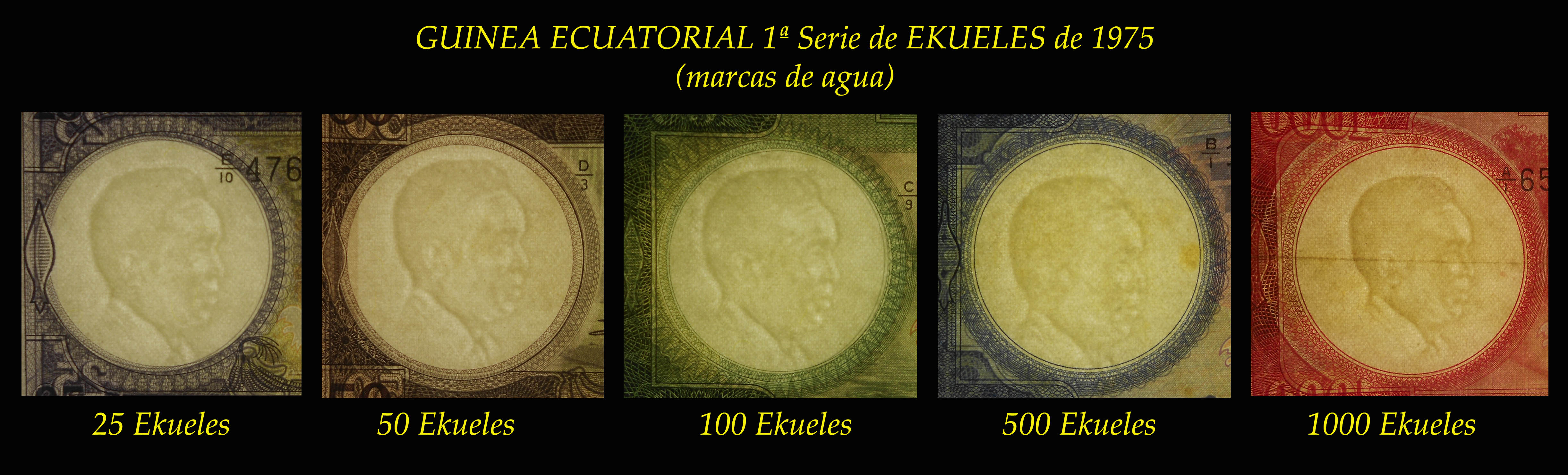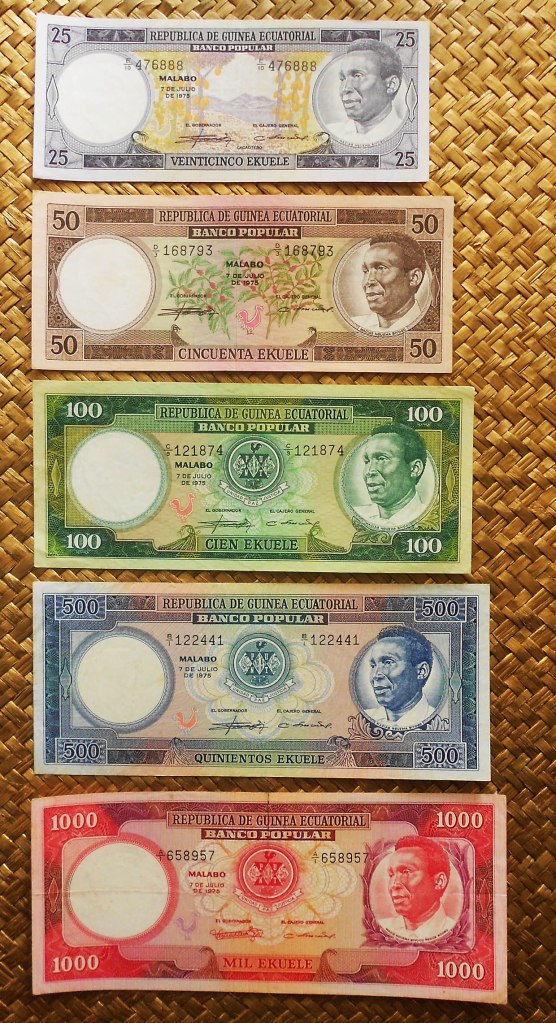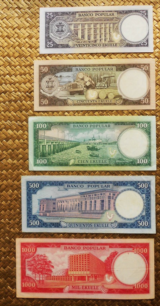 La serie que os muestro está formada por los billetes de 25, 50, 100, 500 y 1000 ekueles de 1975. Emitidos por el Banco Popular de la República de Guinea Ecuatorial, fueron impresos por Thomas de la Rue & Company Ltd. de Londres.