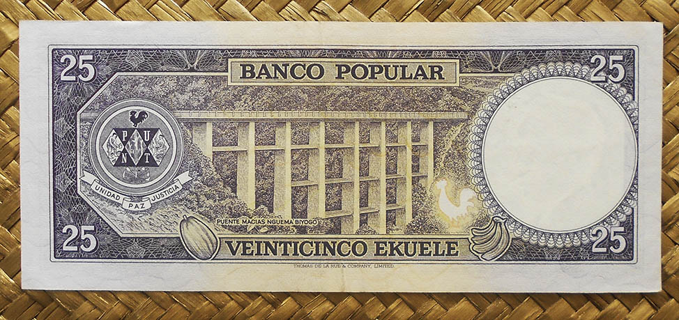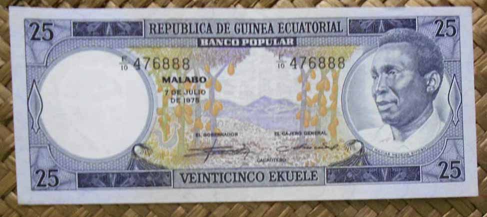 El billete de 25 ekueles nos muestra a Macias Nguema en el anverso y para el reverso el puente Macias Nguema en Malabo.