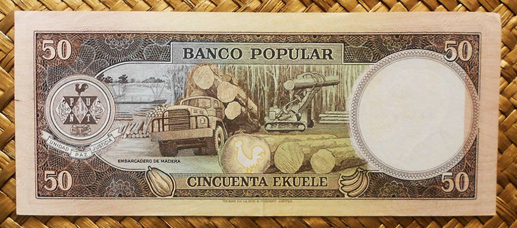 El billete de 50 ekueles nos ofrece en el anverso a Macias Nguema y tala masiva de árboles y su transporte al embarcadero en el reverso.