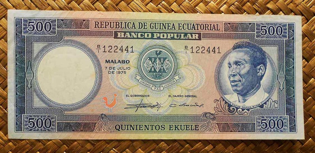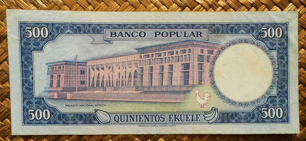 El billete de 500 ekueles muestra nuevamente a Macias Nguema en el anverso y el Palacio Presidencial al reverso.
