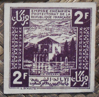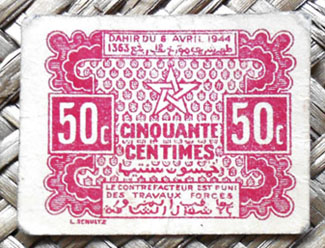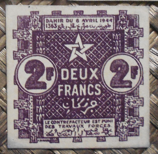 Grabados sobre cartón (L. Schultz), sin ningún tipo de seguridades ni firmas, pero con el encanto de lo creado ante la escasez. Sus pequeñas medidas: 40×35 (mm) el de 0.50 francos, 44×40 (mm) el de 1 franco y 40×40 (mm) el de 2 francos. De impresión monocromática ofrecen los textos en francés y en árabe y la fecha en calendario gregoriano (año 1944) y en musulmán (AH 1373).