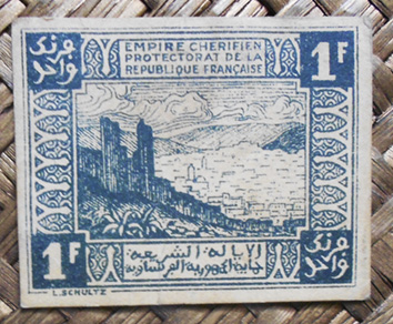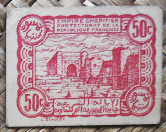 El billete de 50 céntimos de fr. de Marruecos Protectorado francés de 1944 nos ofrece al reverso la imagen de parte de la muralla de Rabat, concretamente desde la Bab El Had, o puerta de Marrakech, sobresaliendo del resto de la muralla y torres calle abajo. Su construcción data del s. XII, de la época almohade.