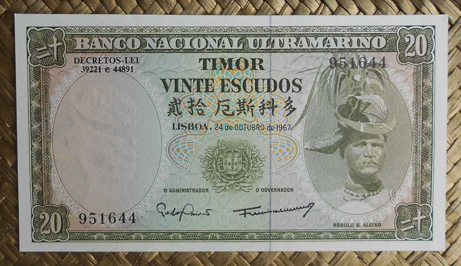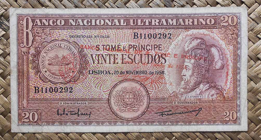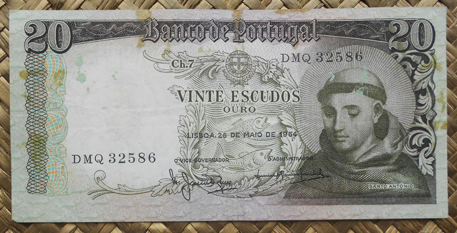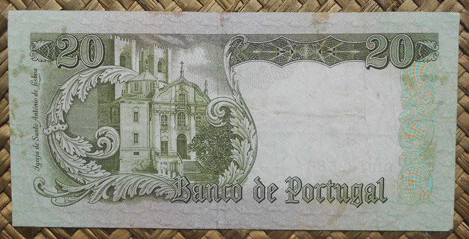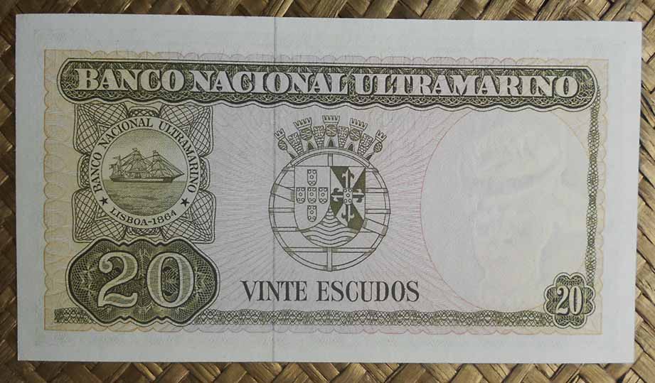 El billete de 20 escudos de Angola de 1962 cambia al anverso el personaje del medallón derecho, en el que vemos el retrato del presidente portugués Américo Tomas. Tonalidades verde oliva en ambos lados. En el reverso repite el grabado de la manada de impalas corriendo por la sabana.