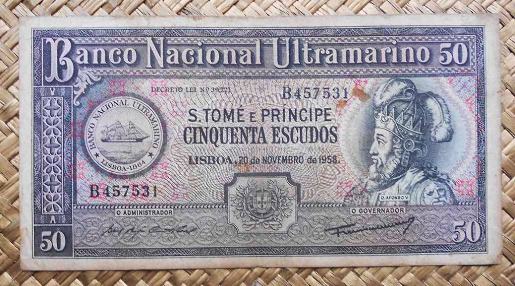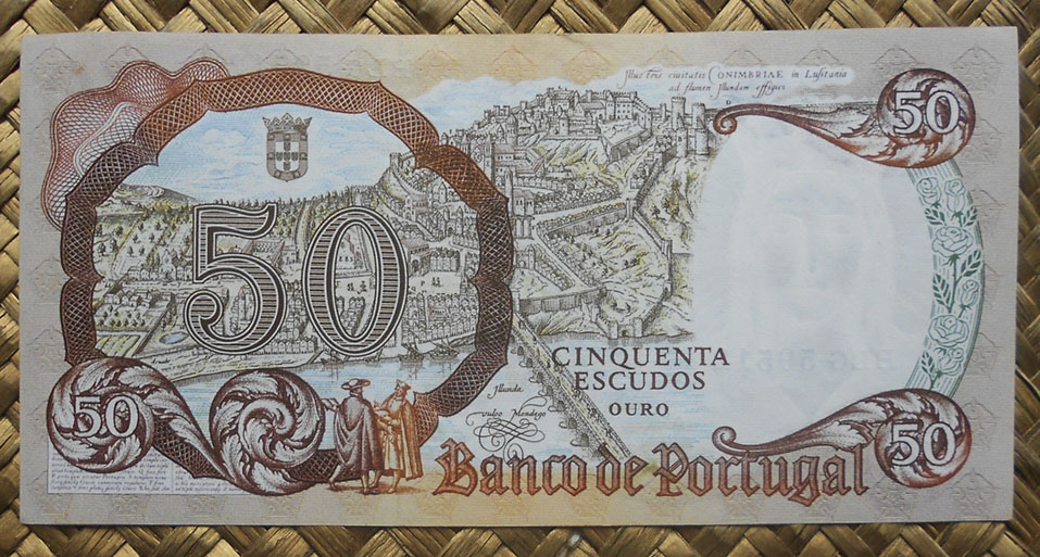 El ejemplar de 50 escudos de Angola de 1956 nos ofrece en su anverso derecha un óvalo enmarcado con el torso de Henrique de Carvalho, al centro una vista del Aeropuerto Craveiro Lopes de Luanda y a la izquierda un Padrao de San Jorge. El reverso nos graba una manada de ñus bebiendo de un remanso de agua. Tonalidades verdes en ambos lados.