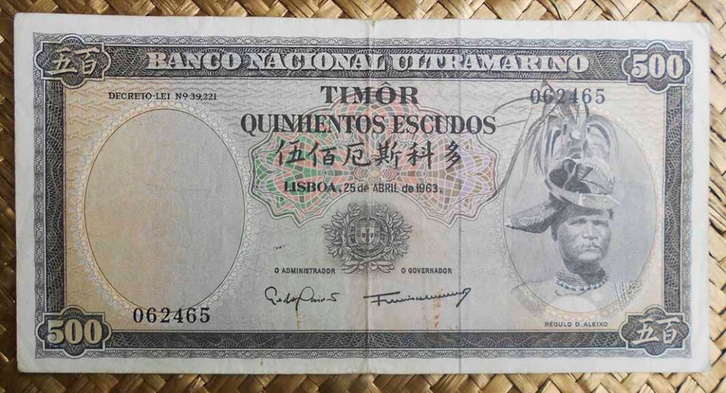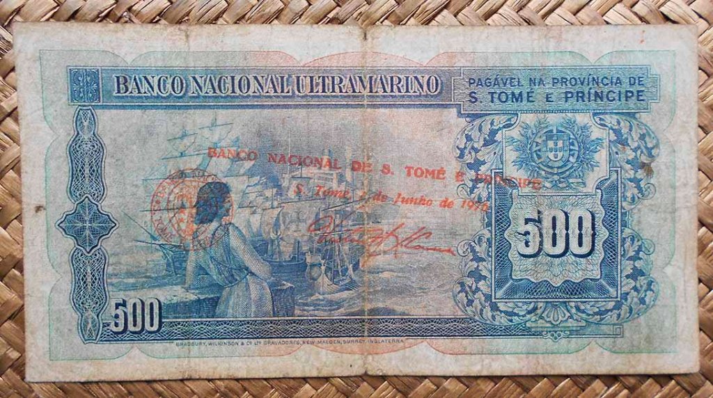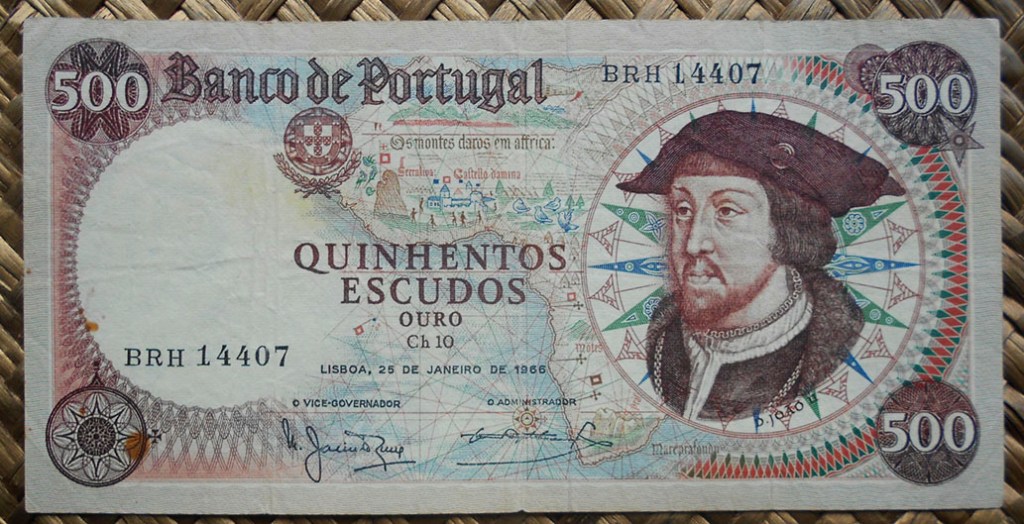 El billete de 500 escudos de Angola de 1962 nos muestra al anverso al Presidente Américo Tomás, acompañado por un grabado de fondo de una vista aérea del puerto de Luanda, la capital angoleña. Esta vez, la imagen del Padrao de San Jorge con su cruz a lo alto se dibuja a la derecha. Para el reverso nos sorprende con un grabado de una pareja de rinocerontes en la sabana angoleña. La tonalidad en ambos lados se torna a rojo-rosácea.