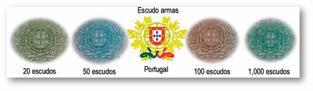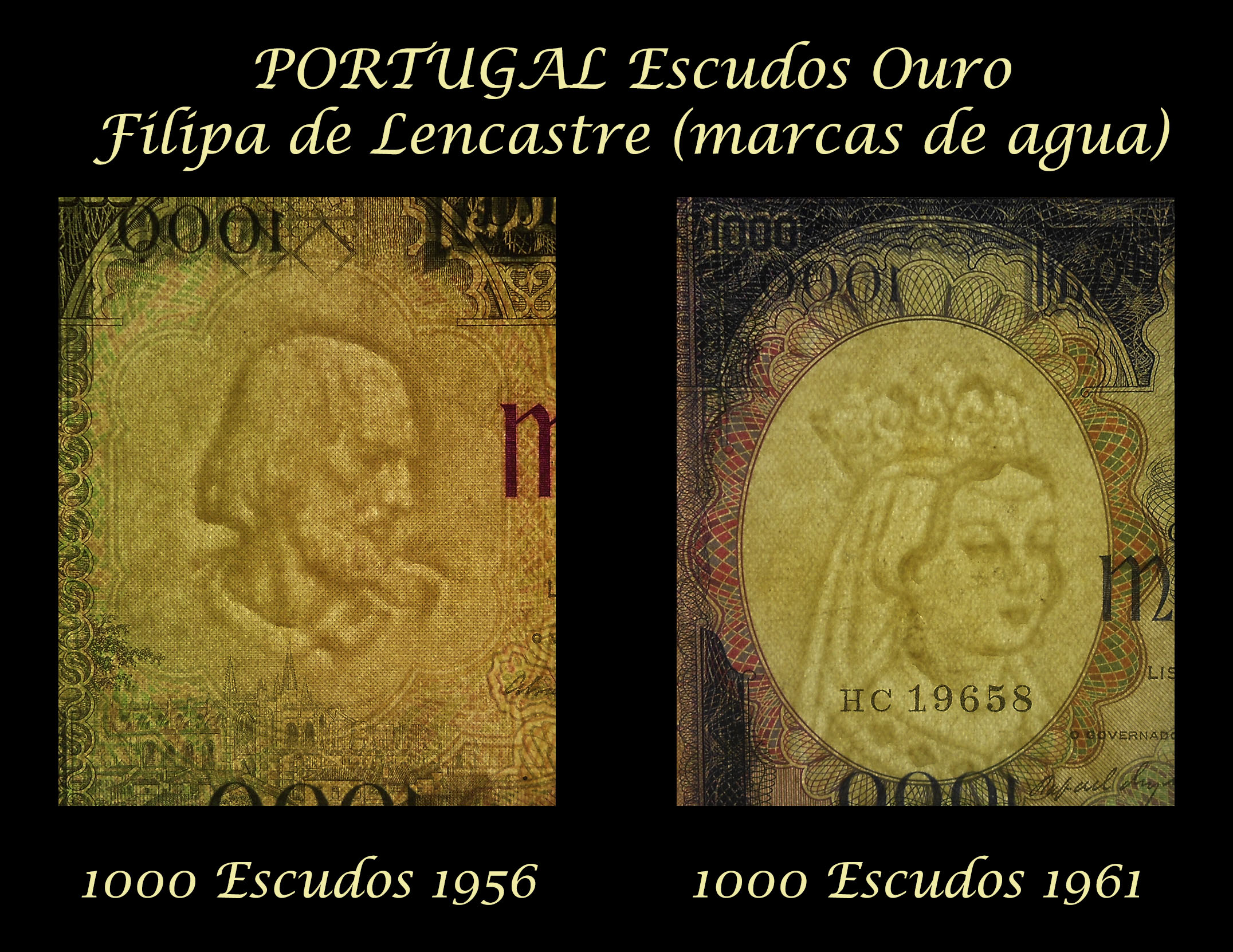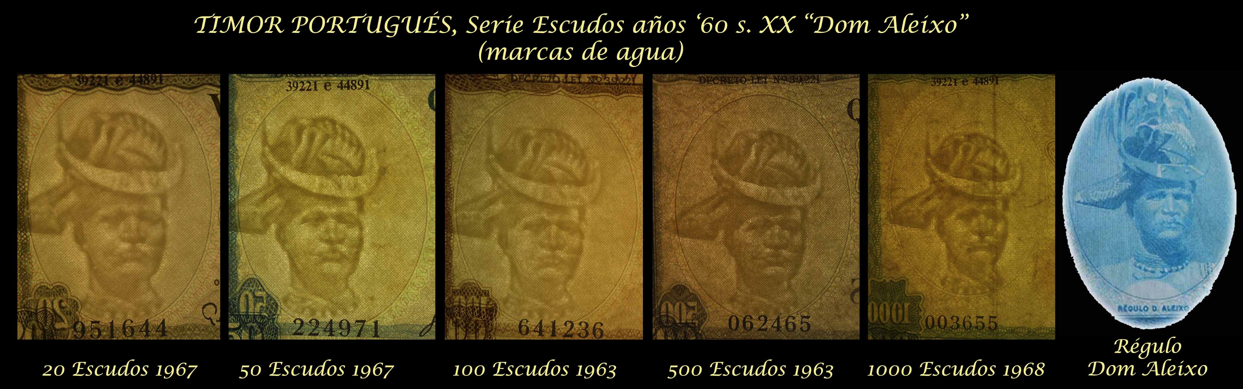 Las marcas de agua, presentes solo en los valores altos (100, 500 y 1.000 escudos), representan la cabeza ladeada de una mujer angoleña con un peinado tribal.
