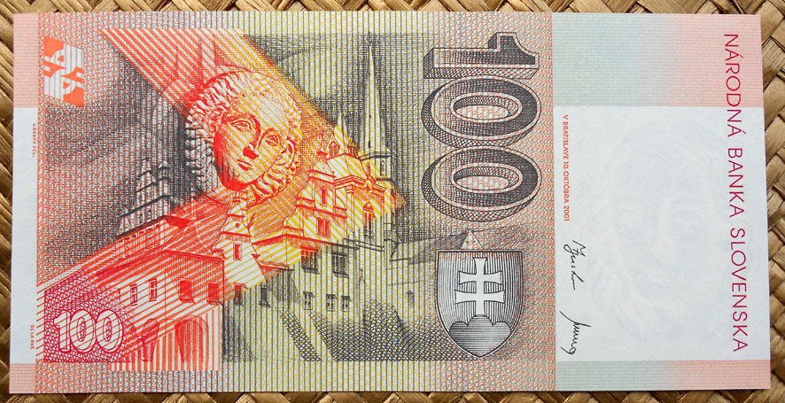 El billete de 100 coronas de 2001 nos presenta a la Virgen del Altar del Nacimiento de la Iglesia de Santiago en Levoca (Madonna de Levoca). Su reverso muestra un relieve de la ciudad de Levoca, en el que sobresale la Iglesia de Santiago y el Ayuntamiento, y sobre ellos una cabeza de piedra gótica de una antigua iglesia de orden franciscana conventual (frailes menores) de la ciudad.