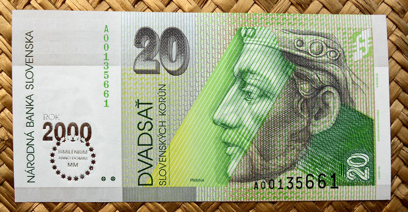 El billete de 20 coronas de 1993 Conmemorativo del Bimilenio nos muestra en su anverso al Príncipe Pribina, gobernador de Nitra que construyera en el s. VIII la primera iglesia cristiana de la Europa del Este. En su reverso una vista aérea del Castillo de Nitra con la torre de la Catedral de Emmeram.