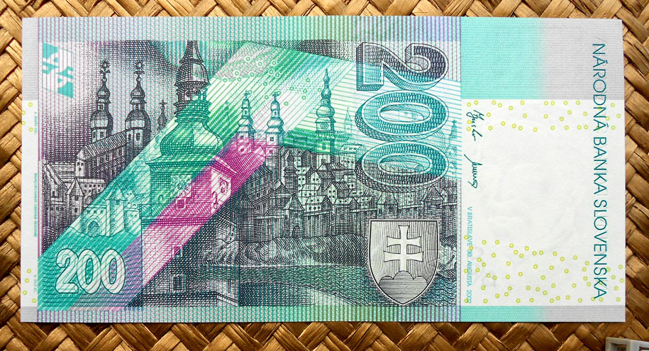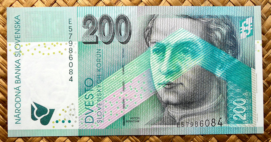 El billete de 200 coronas de 2002 nos muestra a Anton Bernolak, teólogo eslovaco del s. XVIII autor de la primera lengua eslovaca. El reverso nos ofrece un relieve de la ciudad de Trnava (la Roma eslovaca) del s. XVIII con sus magníficas torres renacentistas.