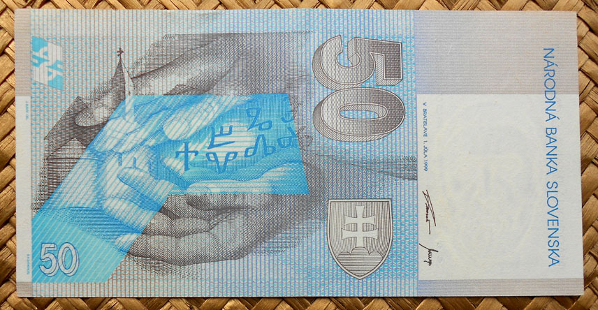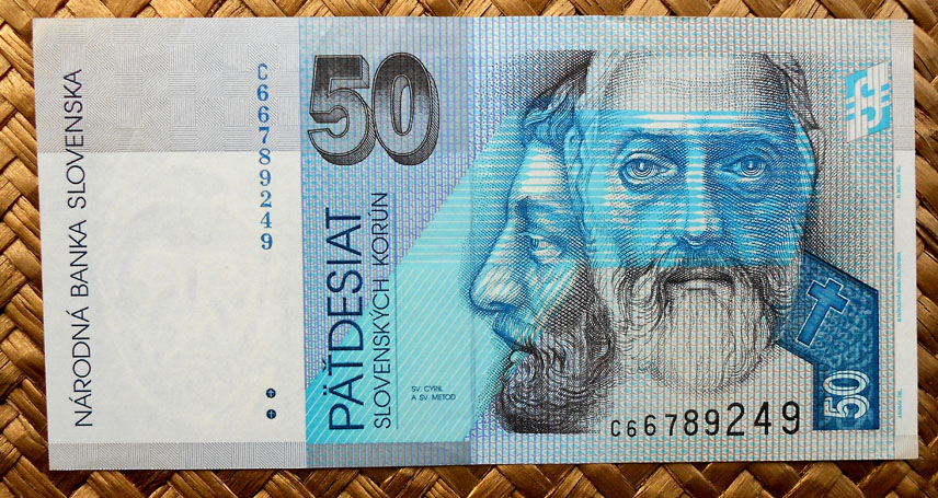 El billete de 50 coronas de 1999 nos ofrece la imagen de los santos Cirilo y Metodio, hermanos griegos bizantinos que llevaron las misiones cristianas ortodoxas a los pueblos eslavos en el s. VIII. El reverso lo ocupa un montaje que muestra la iglesia de San Miguel Arcangel (iglesia Drazovce) sobre la que aparecen las palmas de dos manos con las siete primeras letras del alfabeto gaglolítico (o eslavo del s. IX).