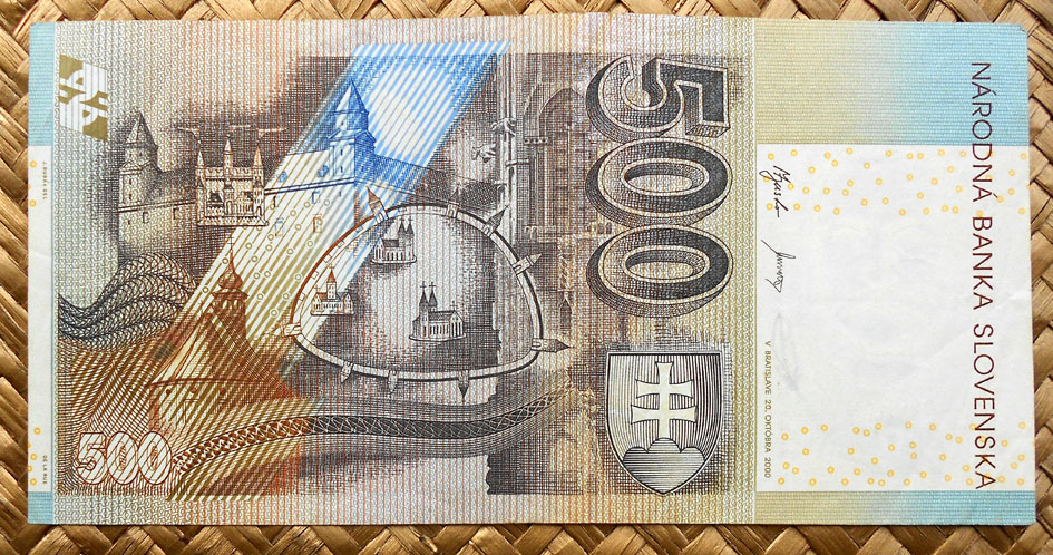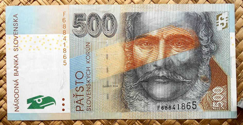 El billete de 500 coronas de 2000 exhibe la imagen de Ludovic Stur, poeta romántico eslovaco del s. XIX y figura destacada del renacimiento nacional a través de su literatura y tratados linguísticos.