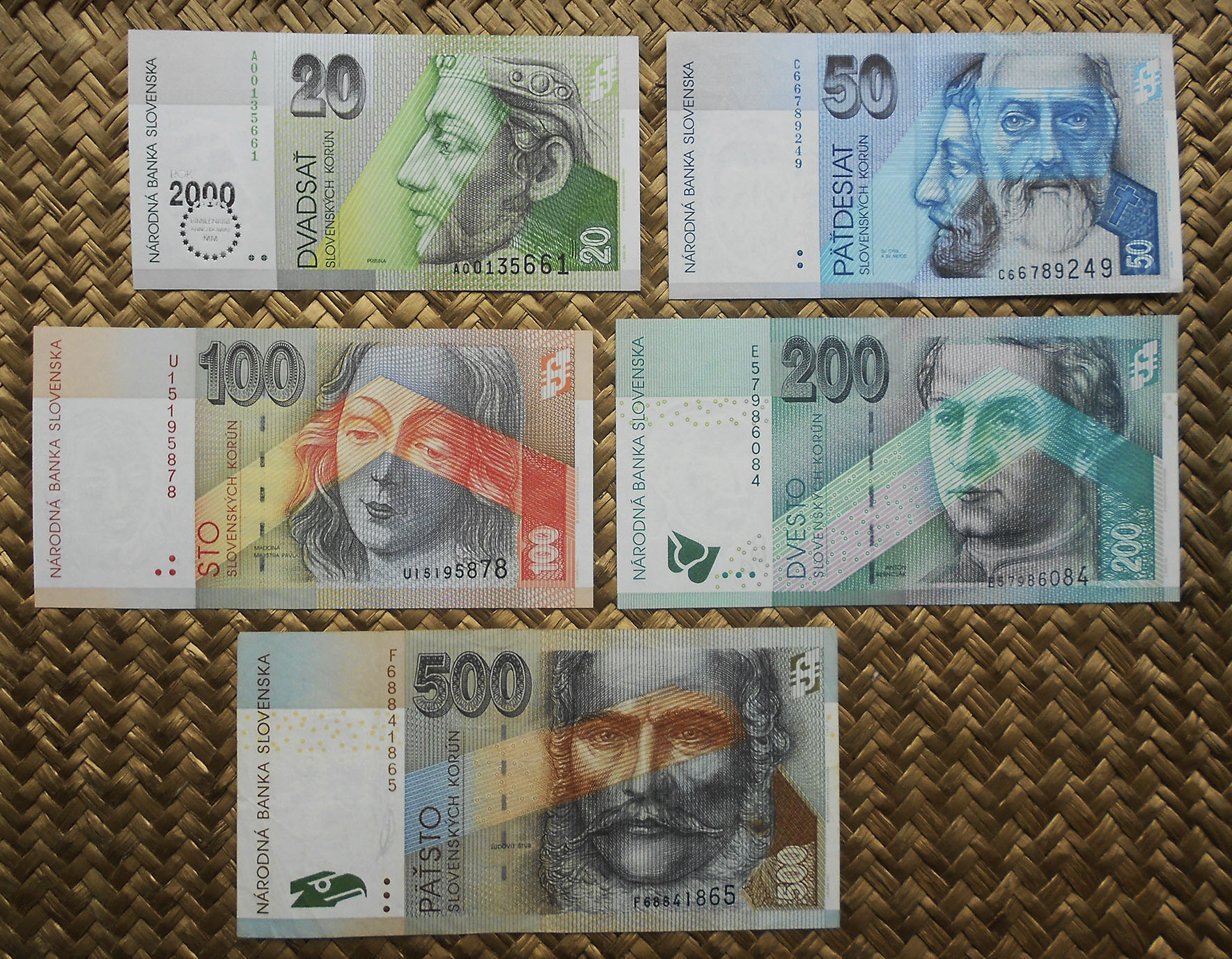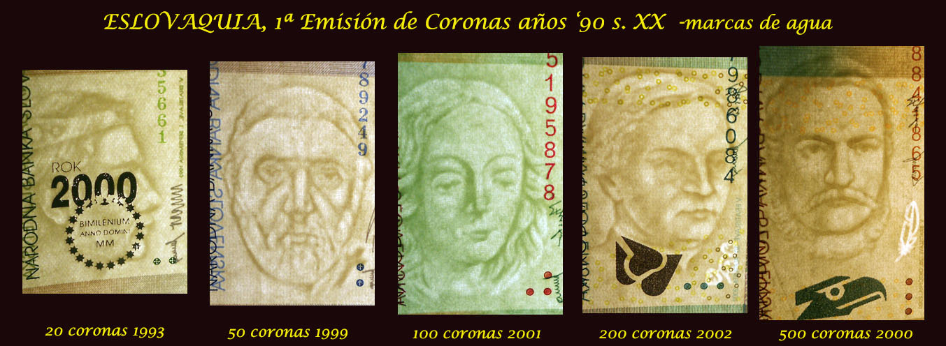 Las marcas de agua en el lado izquierdo representando la misma imagen del personaje que se identifica en el billete. De menor a mayor valor, al príncipe Pribina, a San Cirilo, a la Maddona de Levoca, a Anton Bernolak y a Ludovic Stur.
