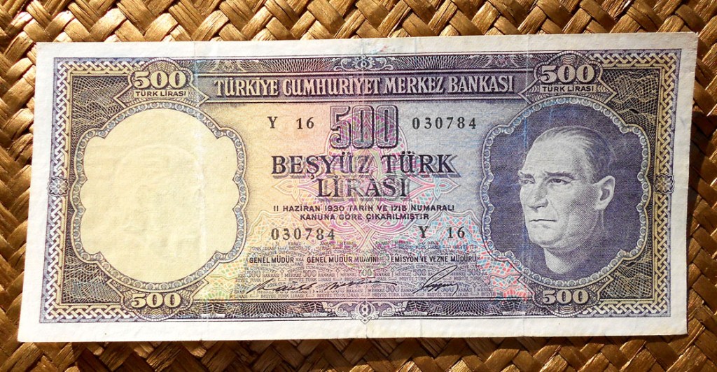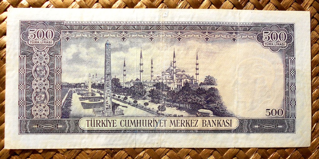 El billete de Turquía de 500 liras de 1953 (L 1930) nos ofrece en su reverso una perspectiva de la Mezquita Azul con sus seis minaretes, a lo largo del paseo del Hipódromo Romano y el Obelisco de Constantino en primer plano. Este diseño se mantuvo también para la serie emitida en 1962.