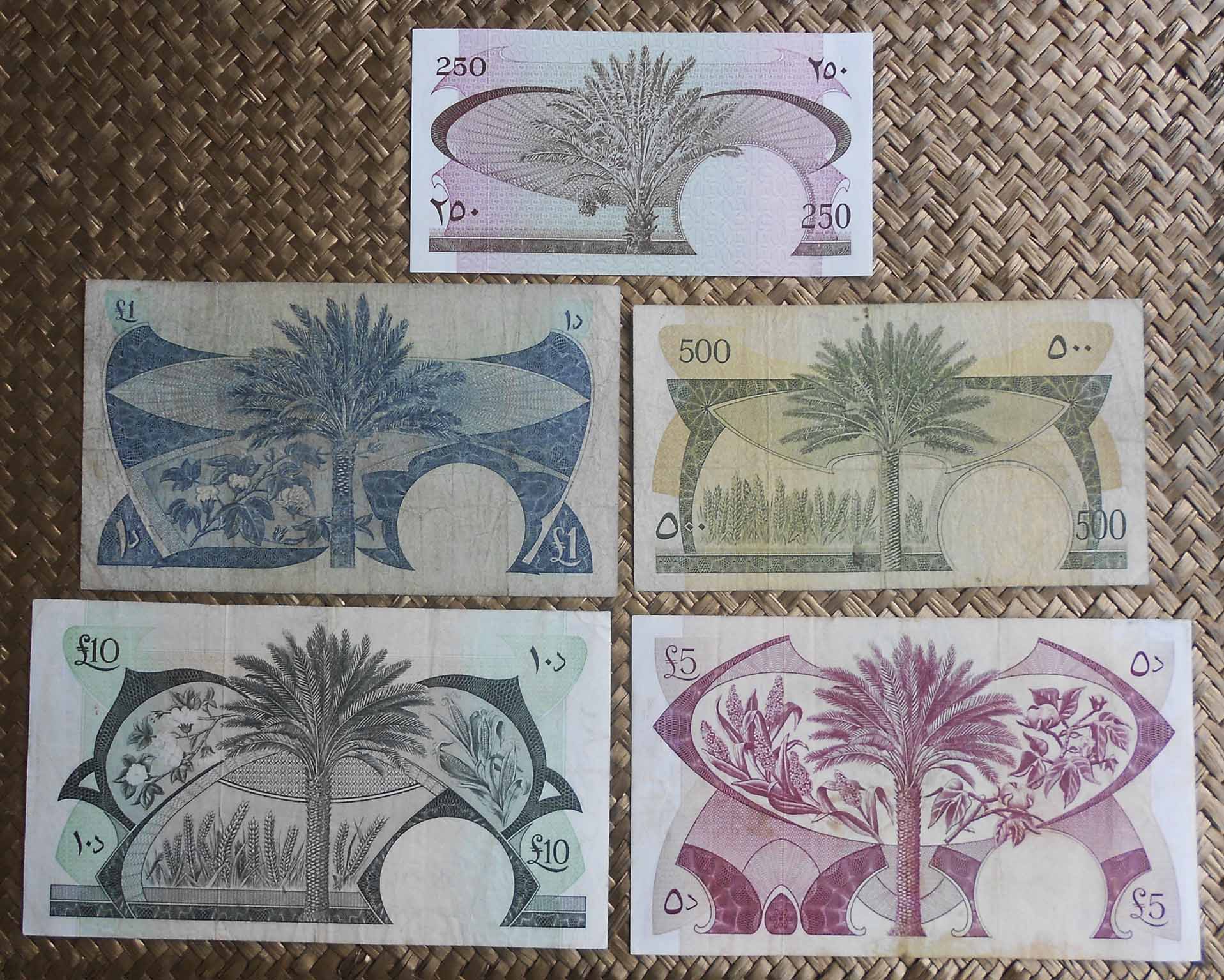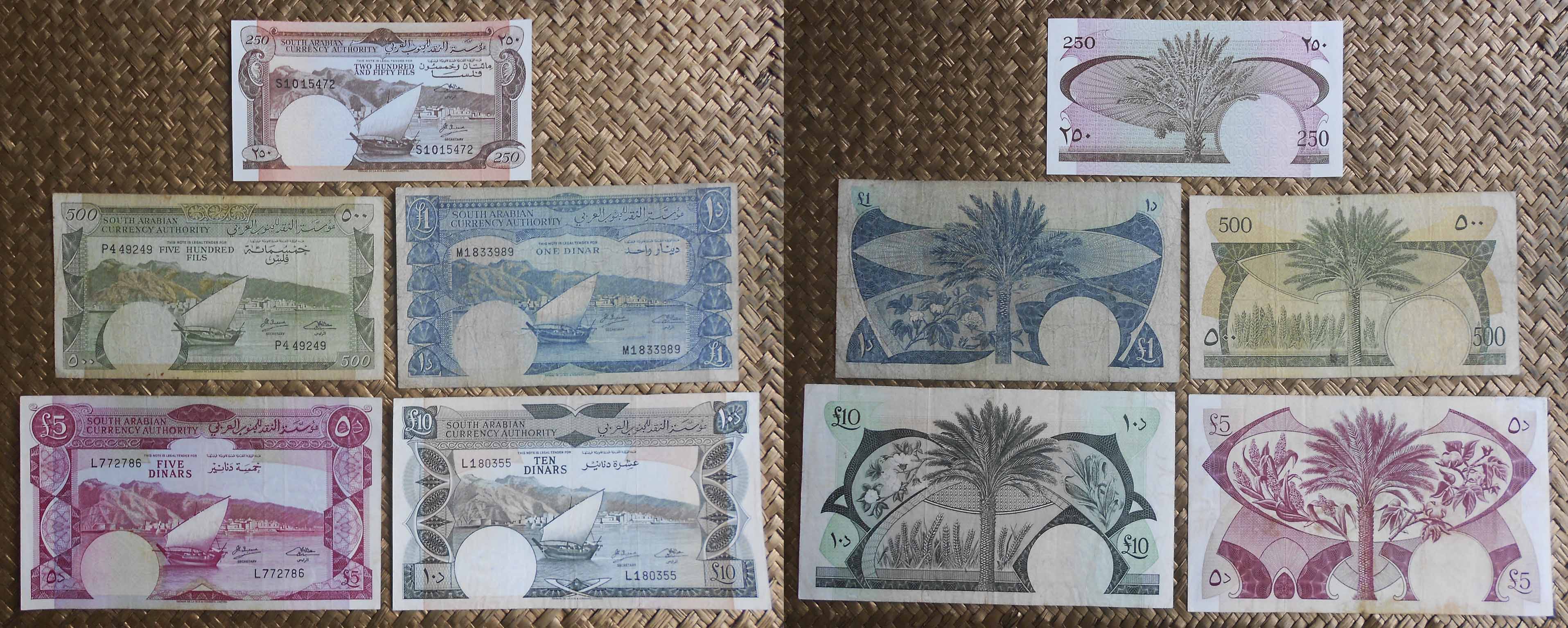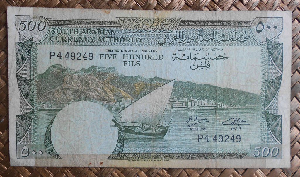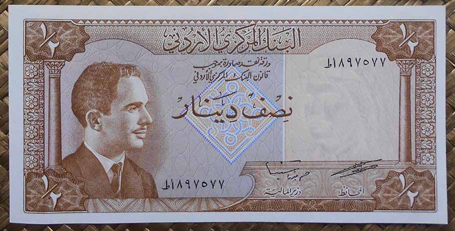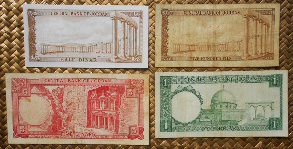 El Reino hachemita decidió devaluar su moneda con el cambio de divisa, de dírham a dinar, donde 1 dirham=100 fils y 1 dinar=10 dirham. De ahí que los billetes mostrados, con apenas una década de distancia temporal, valgan lo mismo (500 fils = ½ dinar). Peculiar la semejanza entre ambos, en los que solo cambia el valor del billete en numeración árabe (en los anversos) y el valor en numeración occidental y texto inglés (en los reversos).