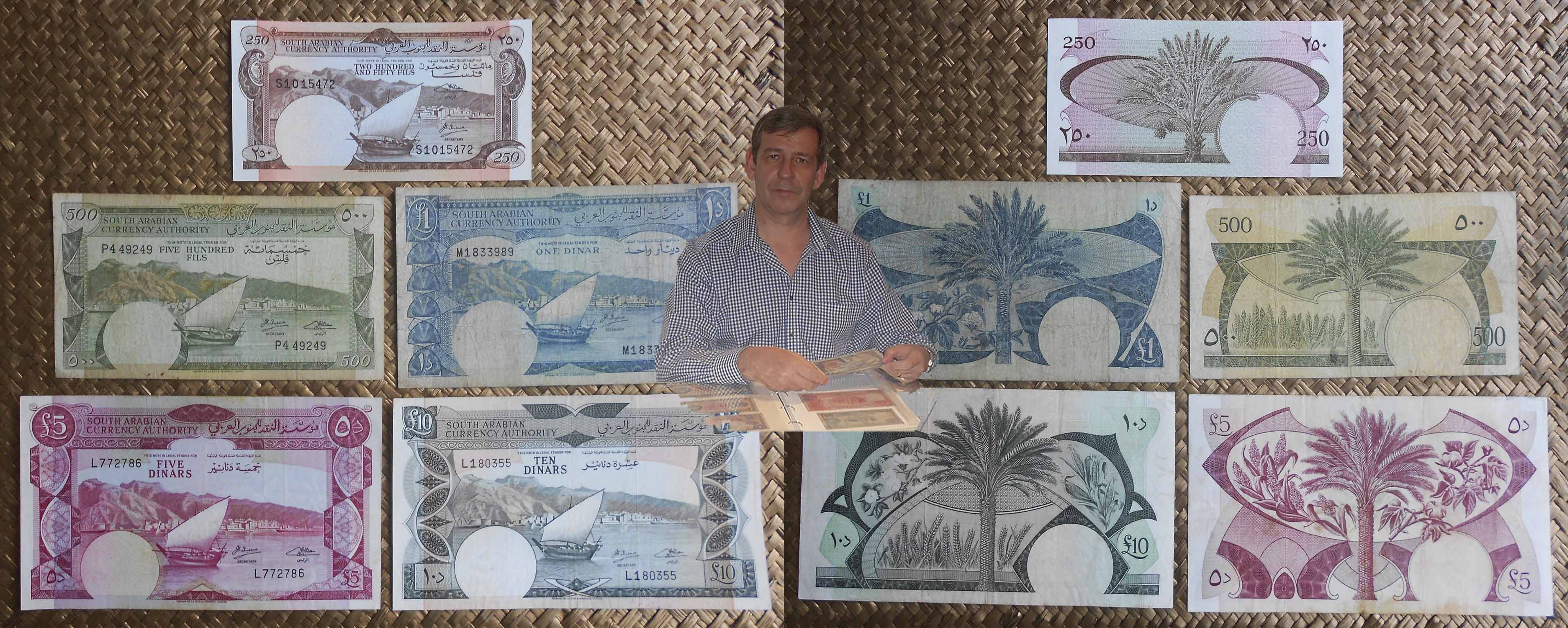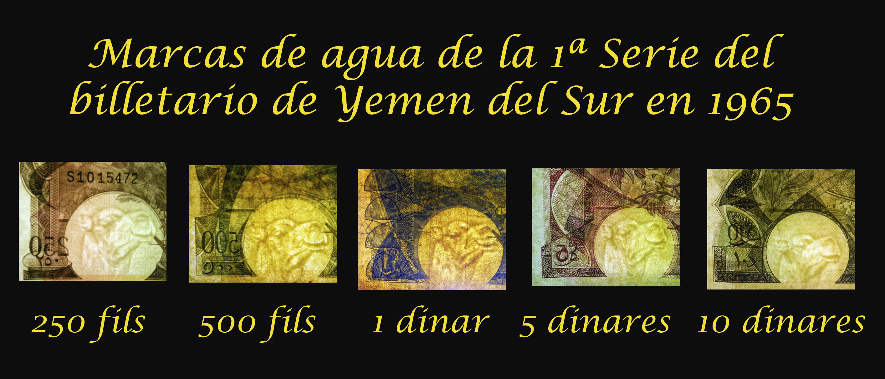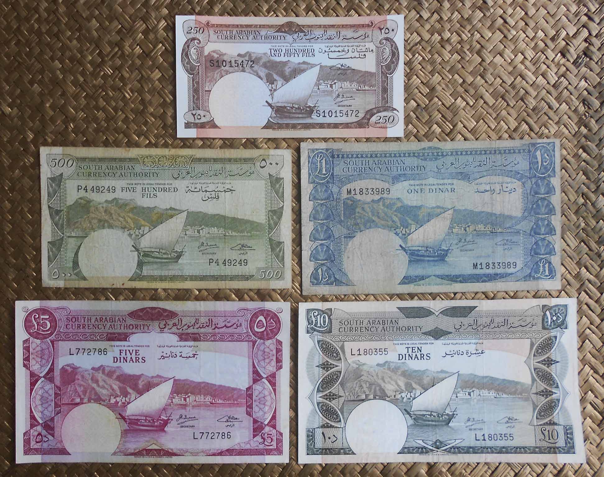 El Reino hachemita decidió devaluar su moneda con el cambio de divisa, de dírham a dinar, donde 1 dirham=100 fils y 1 dinar=10 dirham. De ahí que los billetes mostrados, con apenas una década de distancia temporal, valgan lo mismo (500 fils = ½ dinar). Peculiar la semejanza entre ambos, en los que solo cambia el valor del billete en numeración árabe (en los anversos) y el valor en numeración occidental y texto inglés (en los reversos).