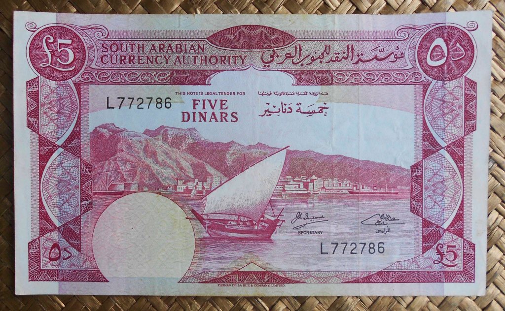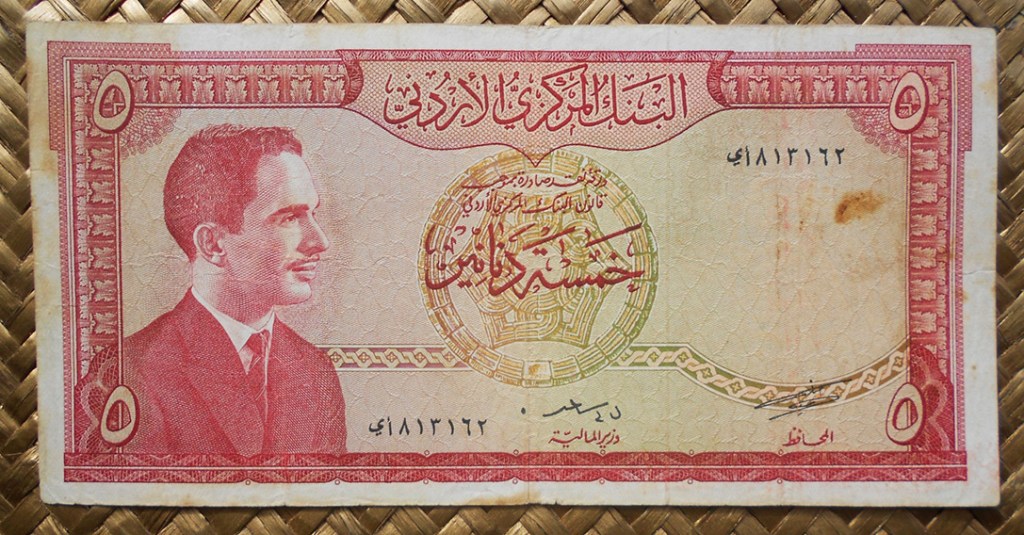 El billete de 5 dinares de Jordania de L1959 2ªed. nos ofrece al anverso el retrato de Hussein I en cromaticidad roja-rosácea. Su reverso reproduce la vista del Tesoro de Petra, su fachada bajorelieve de 40x28m excavada en la roca en el s. I adC, mezcla de arquitectura helenística y nabatea.
