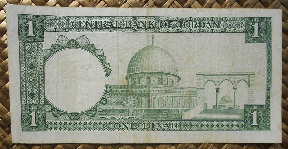 El billete de 1 dinar de Jordania de L1959 2ªed. nos muestra en su anverso al joven rey trajeado, esta vez en cromaticidad verde. Su reverso nos deleita con el Domo de la Roca o cúpula que preside la explanada de las Mezquitas de Jerusalem. Patrimonio de la Humanidad por la UNESCO desde 1981, es considerado lugar sagrado tanto para el Islam como para el Judaismo y el Cristianismo.