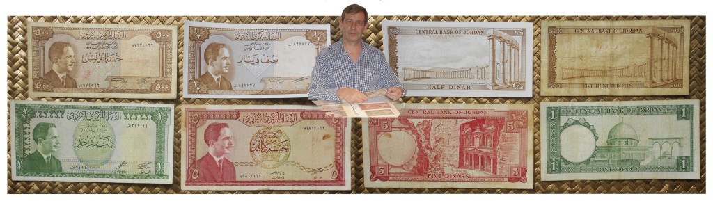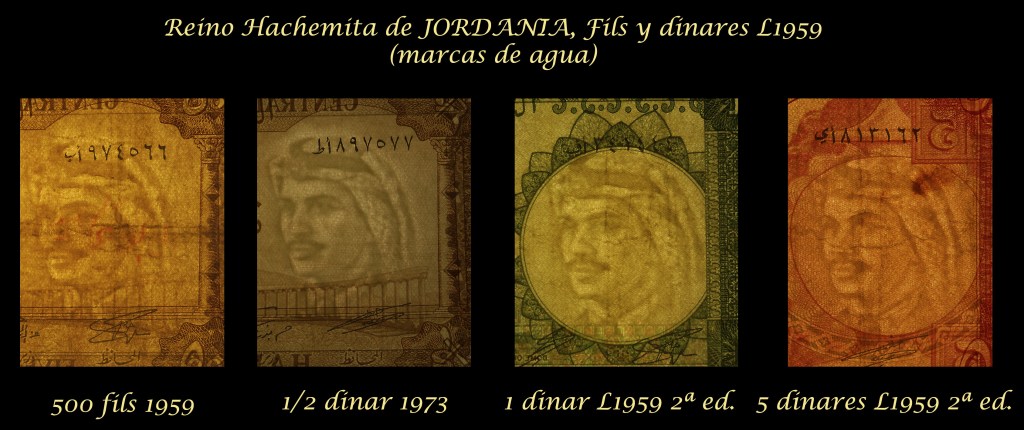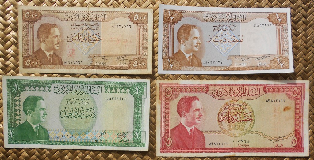 Vamos a revisar billetes jordanos de los años ’60 y ’70 del pasado siglo emitidos por el Central Bank of Jordan en su 1ª y 2ª edición. Contemplaremos los valores de 500 fils de 1959, ½ dinar de 1973, 1 dinar y 5 dinares de L1959-2ªed. (no fechados). Sus anversos nos ofrecen cabeza y torso ladeado de un joven rey Hussein I en traje civil. Textos y numeraciones en árabe, marcos y cicloides en tonalidades monocolor por valores.