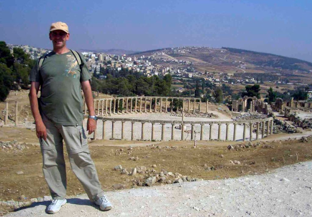 El billete de 500 fils de Jordania de 1959 nos muestra en su reverso el foro o plaza Oval de Jerash, rodeado de 56 columnas de cuatro cuerpos de piedra, capiteles jónicos y dinteles curvos uniéndolas rodeando la plaza. Su anverso está presidido por la imagen (cabeza ladeada y torso) de un joven rey Hussein de Jordania, que presidió el reino hachemita entre 1952 y 1999. Cromaticidad predominante amarronada.